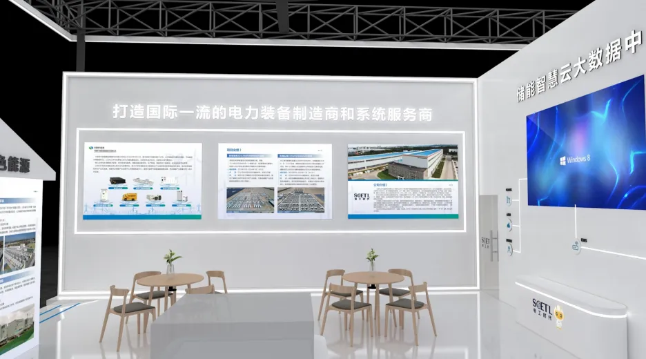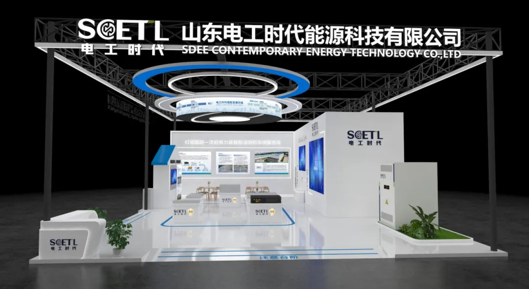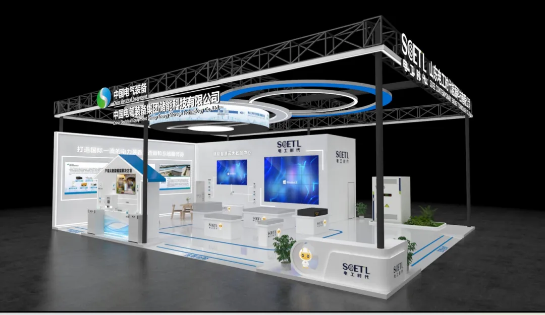 本次展位设计紧扣 “储能赋能未来,科技引领变革” 核心主题,以 “极简科技 + 国企底蕴” 为设计基调,打造集展示、体验、洽谈、互动于一体的沉浸式能源科技空间,让每一位参观者从踏入展位开始,便能直观感知电工时代在储能领域的技术积淀与创新活力!展位整体以品牌标志性的科技白 + 深海蓝为主色调,白色基底彰显国企的专业严谨与纯净质感,蓝色线条与灯组点缀则呼应储能行业的科技属性与绿色能源特质。顶部采用通透式桁架结构搭配环形科技灯组,多层环形软膜层层递进,既增强空间纵深感,又通过光影变化营造 “能源循环、科技迭代” 的视觉隐喻,夜间展示效果更具冲击力。入口处设置超大尺寸品牌标识墙,醒目呈现 “SCETL 电工时代” 及 “山东电工时代能源科技有限公司” 全称,搭配中英文企业简称,强化品牌记忆点;背景墙简洁留白,第一时间传递品牌权威感。- 全场景方案展示区以开放式展陈布局,划分户用、工商业、电网侧三大场景板块。户用太阳能储能解决方案区搭配小型实物样机与图文展板,直观呈现家庭能源自主模式;工商业与电网侧方案区通过高清展板、数据图表展示系统架构与应用案例,清晰传递 “全场景覆盖、全链条服务” 的能力,让参观者快速理解解决方案的适配性与价值。