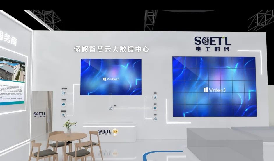 在展位侧边打造简约舒适的洽谈空间,搭配原木色桌椅与绿植点缀,弱化工业风的硬朗感,兼顾专业感与温馨感,为行业伙伴提供深度交流、共探合作的私密场景,契合展会商务对接需求。依托精心打磨的展位设计,电工时代全方位展示核心技术实力,以全场景解决方案、智慧化技术、硬核产品矩阵,成为展会现场储能领域的焦点展位。