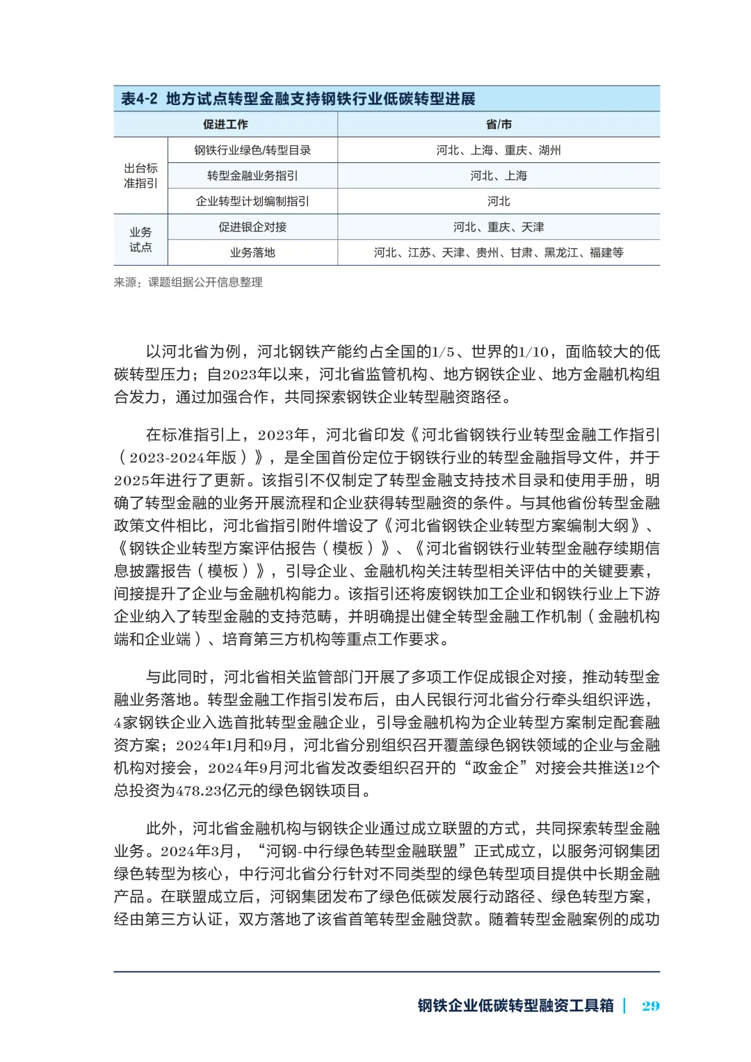 融资工具方面,信贷以绿色信贷、转型贷款为主,绿色信贷利率优惠,转型贷款需企业制定转型计划;债券融资中,央/国企是可持续债券发行主力,民企需增信;股权融资案例较少,宝武绿碳基金为代表;创新工具如融资租赁、混合融资、银保联动、碳差价合约等也有实践。地方试点如河北出台钢铁行业转型金融指引,推动银企对接与业务落地。