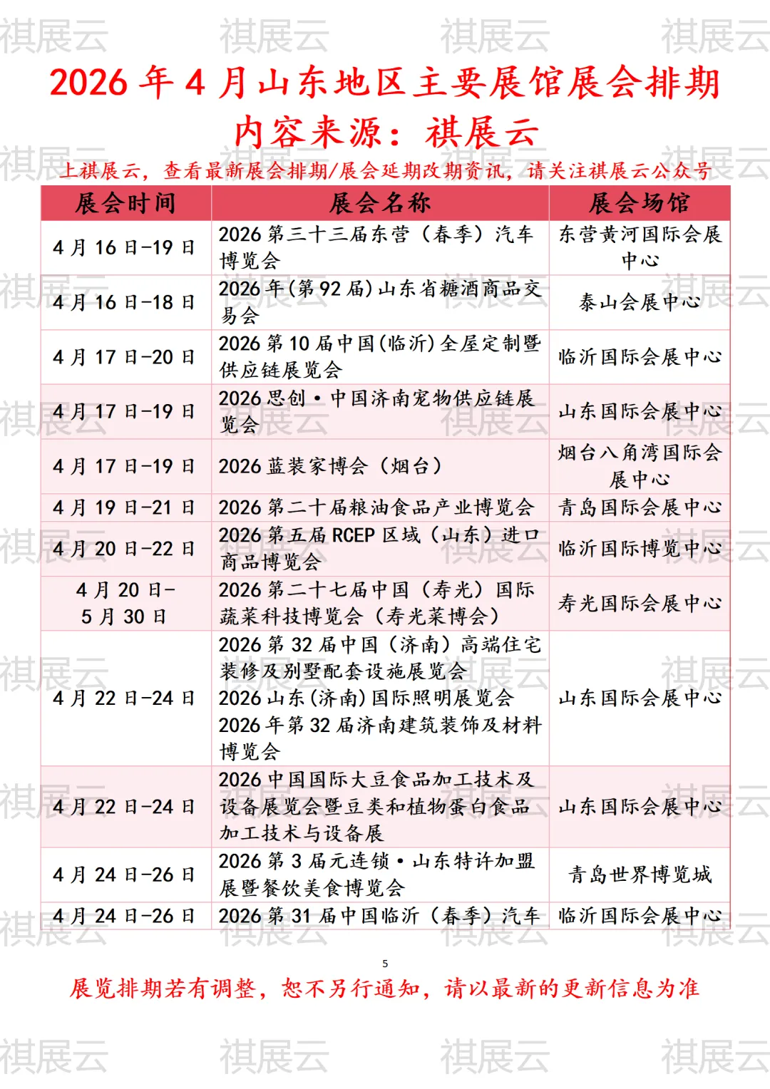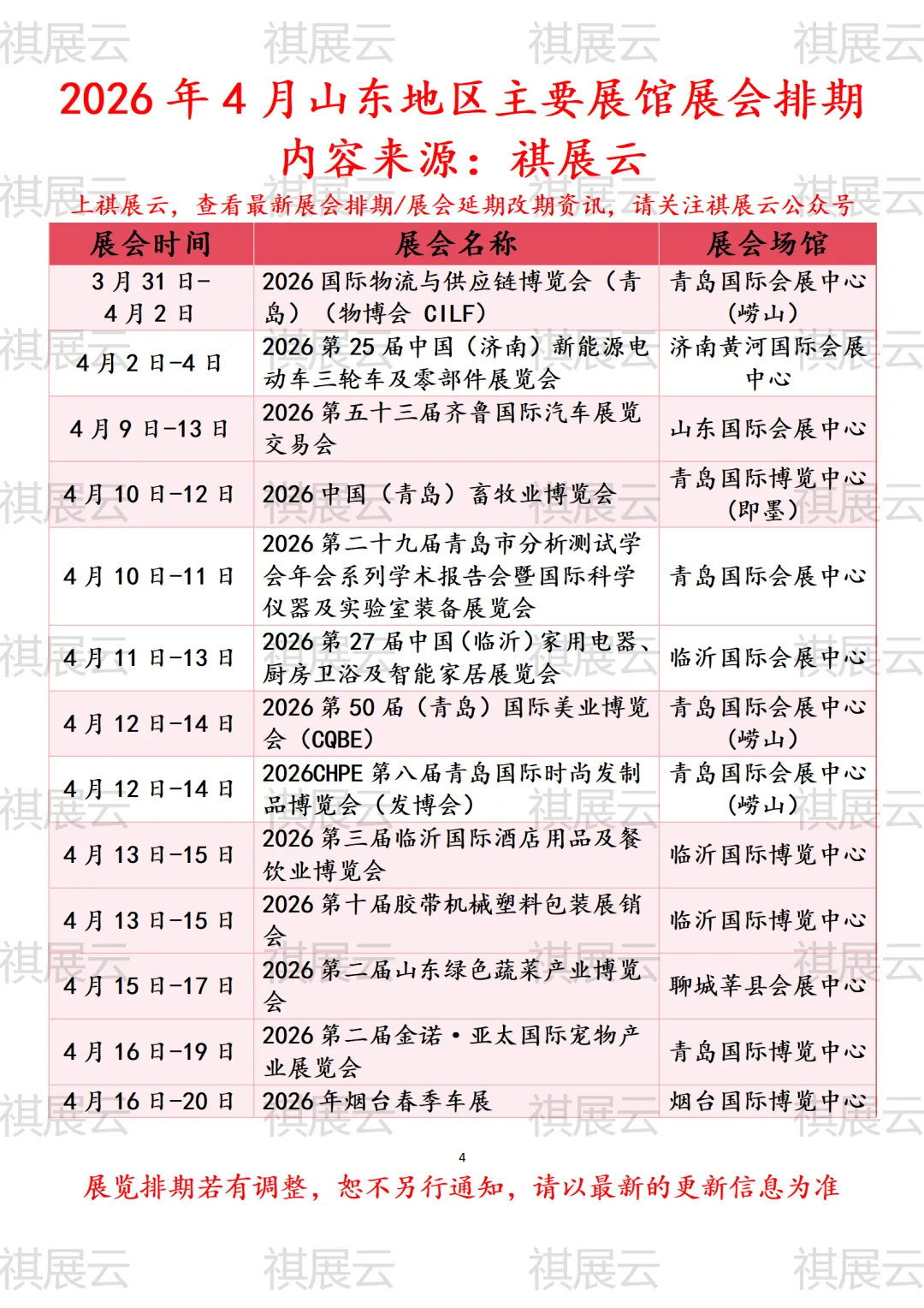 会展资讯丨山东(济南/青岛/临沂/威海/烟台/潍坊/广饶/东营/泰山/寿光)地区主要展馆2026年4月时间表