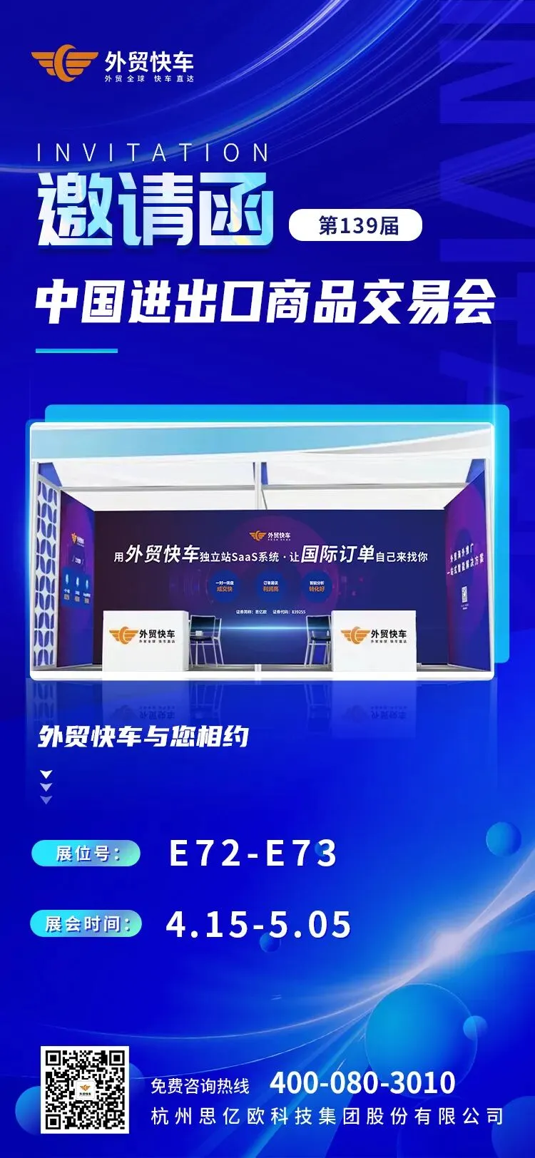 4月15日-5月05日,天桥区E72-73展位,期待与您面对面深度交流。让外贸快车为您的出海之路插上数字化翅膀,助您在这个春天满载商机、不虚此行!