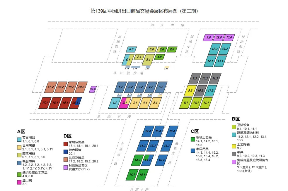 餐橱用具展区、家居装饰展区、编织及藤铁工艺品展区、家居日用展区、钟表眼镜展区、日用陶瓷展区、玻璃工艺品展区、园林产品展区、个人护理用品、礼品及赠品、工艺陶瓷展区、家具展区、铁石(户外)、浴室用品展区、玩具展区、宠物用品展区