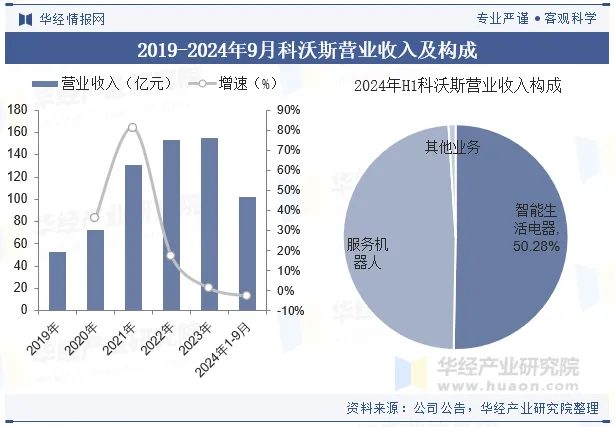 科沃斯成立于1998年,历经多年发展逐渐成长为服务机器人+清洁电器龙头。据公司公告,自1998年成立以来,科沃斯始终致力于技术研发和品类创新,经过20余年发展,公司已经成为全球家用服务机器人和智能生活电器行业的引领者,成功构建了科沃斯品牌服务机器人+添可品牌智能生活电器双轮驱动的业务模式。近年来公司营收持续增长,2023年公司实现营收155.02亿元,同比增长1.15%,2024年1-9月营业收入为102.26亿元,同比减少2.91%。分产品看,公司营收主要来源于智能生活电器和服务机器人,2024年上半年两大产品收入合计占比达98.97%。