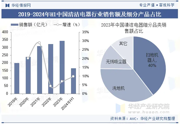 随着城乡居民生活品质的不断提升,以及健康和环保意识的逐步提高,清洁电器的市场需求显著提升,清洁电器行业销售额也呈现出快速增长态势。2019年我国清洁电器行业销售额约200亿元,2023年提升至344亿元。2024年上半年清洁电器销额达到165亿元,同比增长9.8%。从细分品类来看,扫地机器人和洗地机市场表现尤为突出,2023年销售额占比分别为40%、36%。