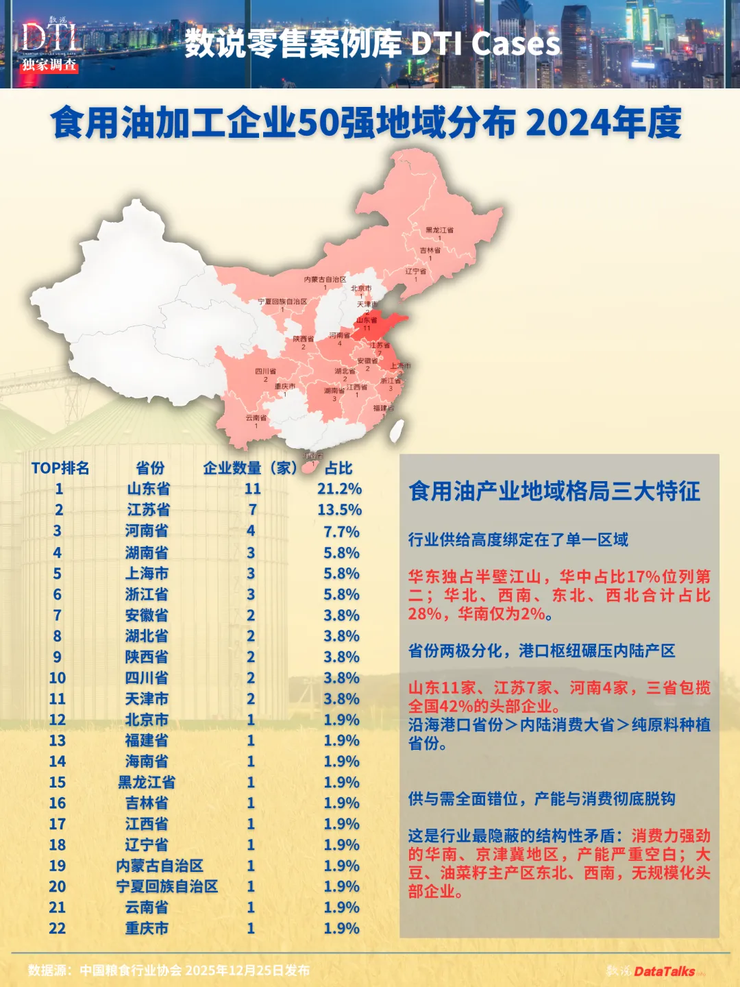 在常识认知中,食用油依附农业而生。油料种植大省,理应是加工企业的集聚高地。这是行业流传最广的误区,也是本次数说零售案例库调查试图揭开的产业真相。基于中国粮食行业协会2025年度官方榜单,我们完成了52家头部食用油加工企业的地域溯源,并筛查17家上市公司、世界500强及国资龙头企业。一组反差的数据,可能会颠覆固有认知:全国52家头部食用油企业中,华东地区以28家、54%的占比绝对领跑全国,成为绝对产业集中区域;东北作为大豆核心主产区,仅3家企业列入重点;华南消费大省广东,竟然无一家头部企业入围。为什么产粮地留不住头部食用油加工企业?为什么中国食用油巨头,集体远离农田、扎堆港口?我们跳出企业数量统计,以地域分布和龙头企业的调研两个维度,盘点一下中国食用油产业的供应链真相。17家食用油上市公司与500强,撑起行业基本盘