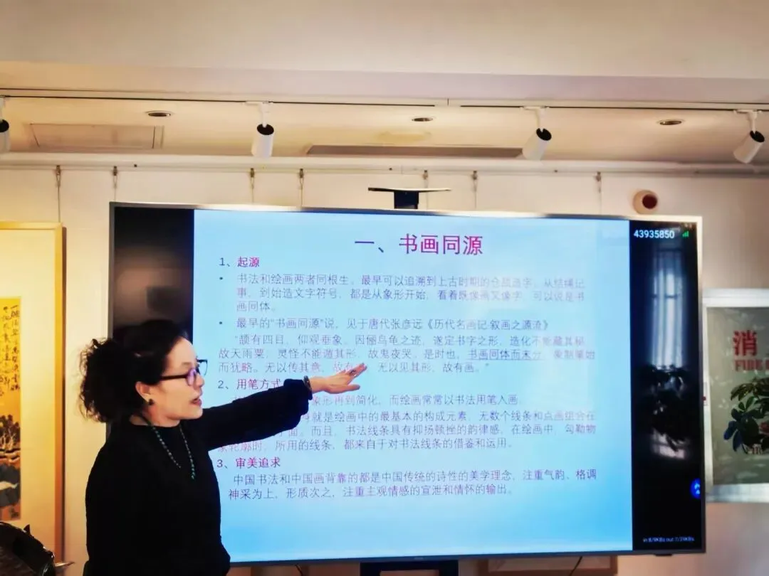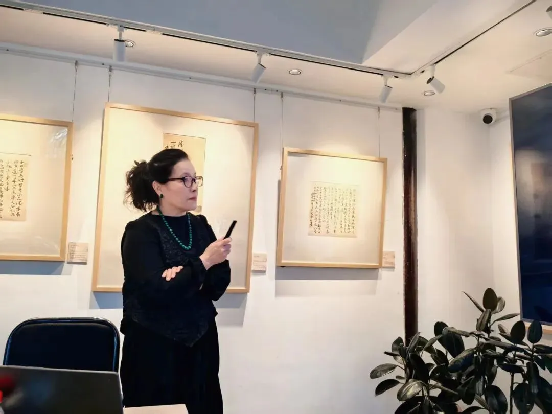 讲座开始之前,由石门书院主理人许彤博士进行开幕致辞。随后,王文英老师以“中国书画的品鉴”为主题,以中国书画的发展脉络为核心,分五大板块展开深度分享。王文英老师从“书画同源”切入,追溯至上古仓颉造字的起源,结合唐代张彦远“书画同体而未分”的理论,阐释二者在象形本源、用笔方式与审美追求上的共通之处;随后梳理“书画分野”的历史进程,详解书法从甲骨文、金文到隶书、行书的独立发展,以及绘画在魏晋后摆脱功利性、走向文人独立创作的演变;在“书画融合”环节,重点剖析宋元文人画兴起后,“以书入画”的艺术实践如何成为传统书画的核心特质,赵孟頫等名家的创作理念与笔墨实践成为关键例证;最后聚焦“现当代书画独立发展”,结合20世纪中西文化碰撞下的书画发展分歧,展现书画艺术在传承中的创新与坚守。