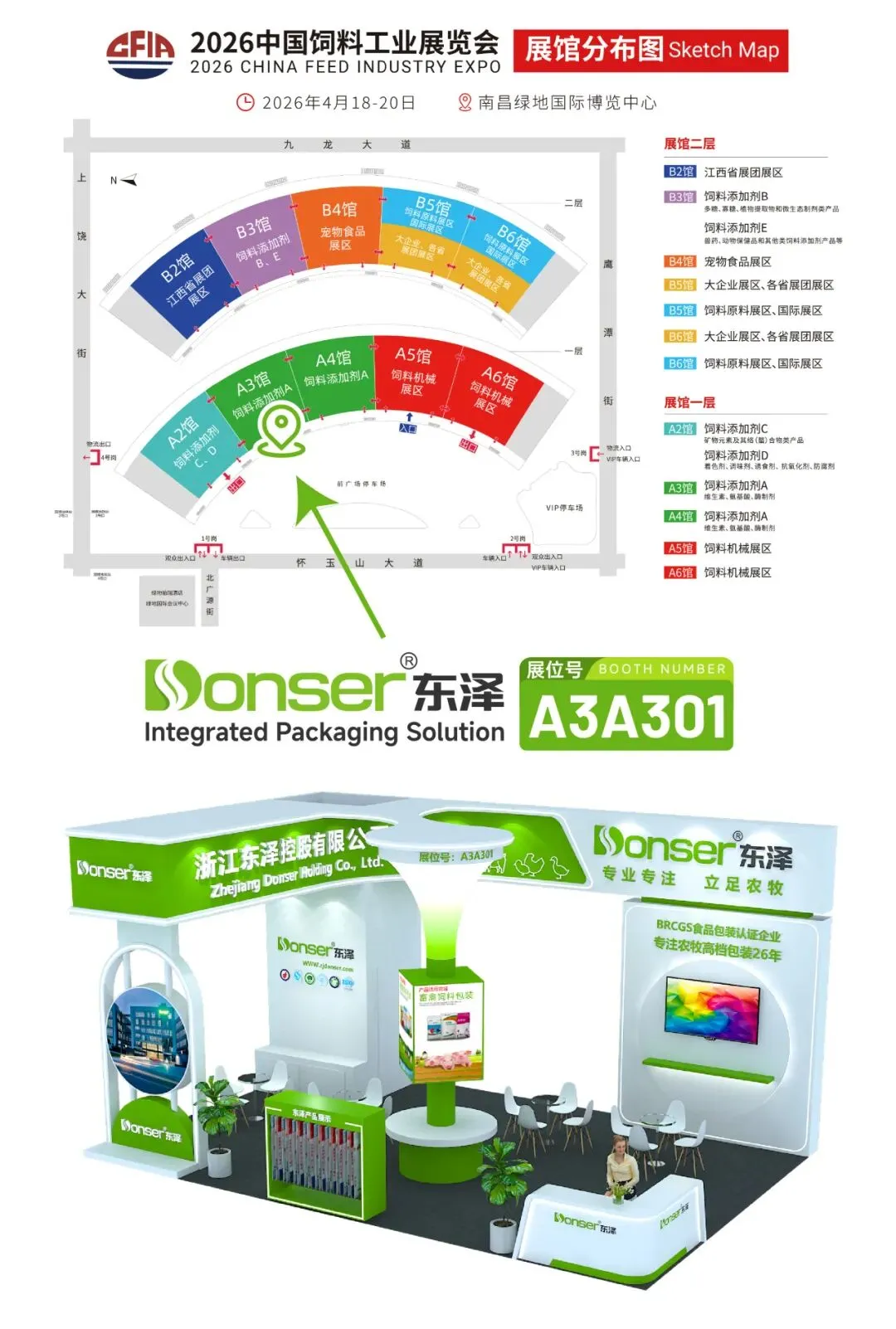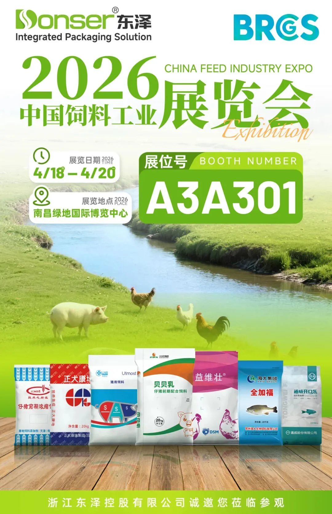 2026年4月18-20日,中国饲料工业展览会将在江西南昌绿地国际博览中心举办,浙江东泽诚邀您莅临A3馆A301展位参观交流。