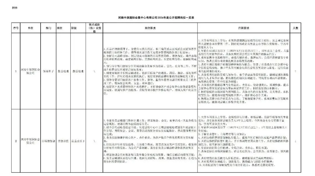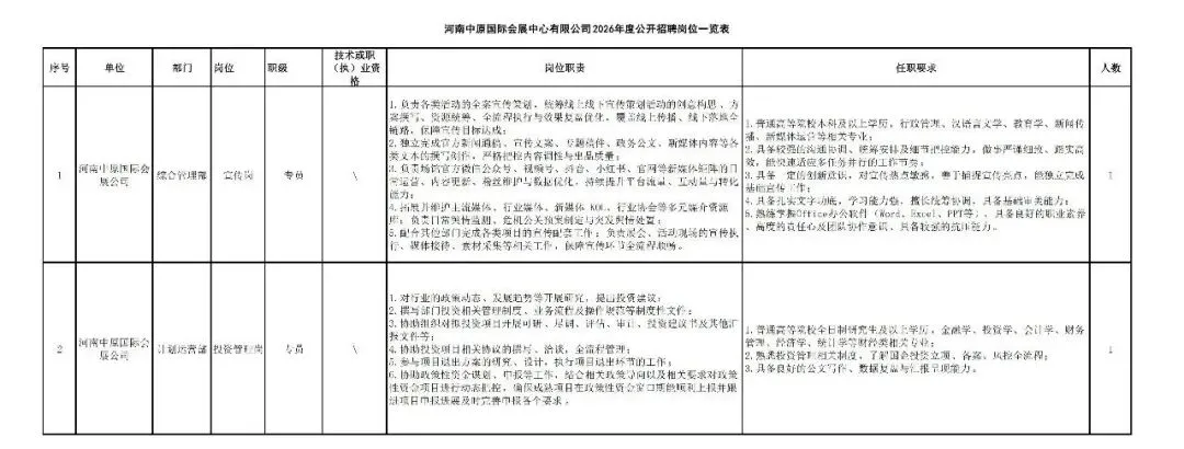 2.岗位要求:各岗位年龄、具体工作职责、任职要求等详见《河南中原国际会展中心有限公司2026年度公开招聘岗位一览表》。