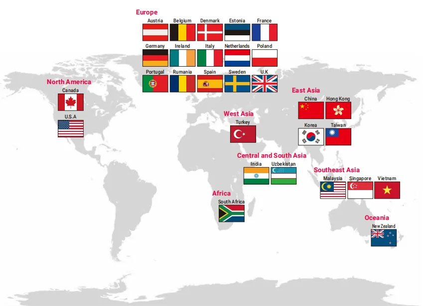 奥地利2个、比利时4个、加拿大1个、中国内地11个、丹麦3个、法国7个、德国8个、中国香港1个、意大利8个、韩国3个、荷兰5个、新西兰3个、波兰2个、葡萄牙2个、南非1个、西班牙2个、瑞典2个、中国台湾2个、土耳其1个、英国13个、美国12个。