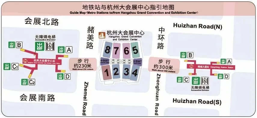 ·前往2号、7号、8号展馆的乘客,可乘坐地铁1号线至杭州大会展中心站A出站口或D出站口,步行约230米即可到达展会现场。