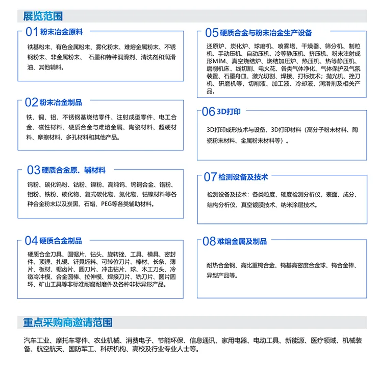 展出面积约2万㎡,汇聚300+家行业企业,预计吸引3万+专业观众。聚焦粉末冶金、硬质合金、工业陶瓷、精密陶瓷、增材制造(3D打印)及粉体装备等全产业链,打造集新品发布、学术交流与商贸采购于一体的国际化专业平台。