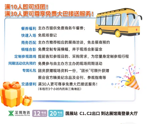 12号线/20号线国展站C1/C2口,国展北站D口,直达深圳国际会展中心。