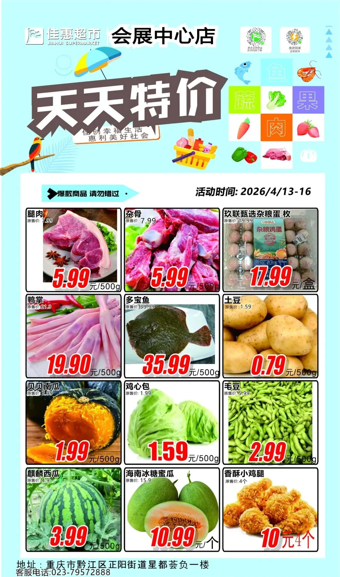【佳惠超市正阳会展店 】4月13日-4月16日,天天特价来袭,来正阳佳惠超市、蔬菜、水果鱼肉一站式优惠享不停.