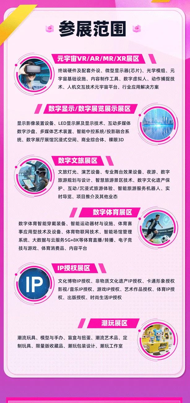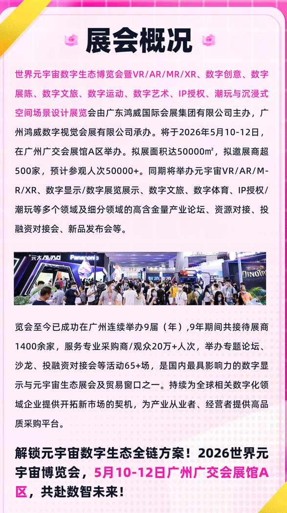 由鸿威会展集团主办,5万㎡展区汇聚500+前沿企业,预计吸引5万+专业观众。聚焦VR/AR/MR/XR硬件、数字显示、数字文旅、数字体育、IP授权及潮玩六大板块,同期联动世界文旅产业博览会等系列展会,举办产业论坛及投融资对接会,打造元宇宙与数字生态全产业链商贸平台。