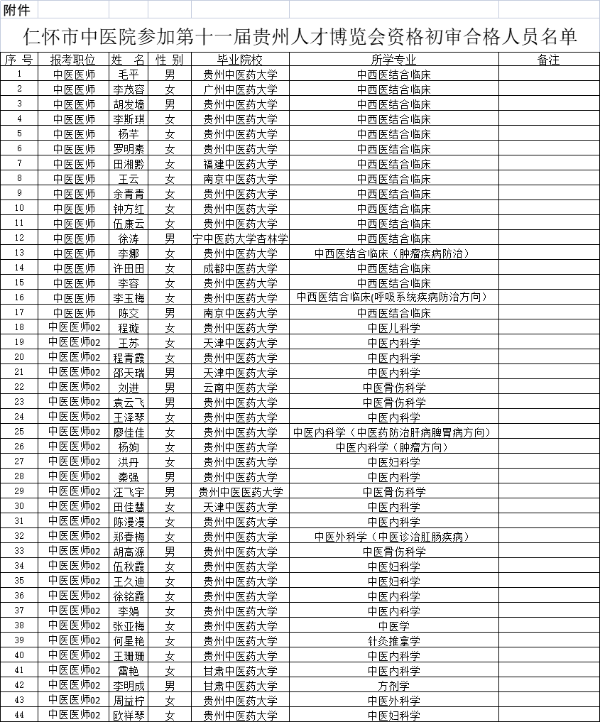 按照第十一届贵州人才博览会有关要求和遵义市《2023年第十一届贵州人才博览会遵义市事业单位人才引进公告》相关要求,仁怀市中医院参加第十一届线上线下贵州人才博览会引才活动已完成线上报名、资格初审工作,现对资格初审合格人员名单及线上初评时间等事宜公告如下。