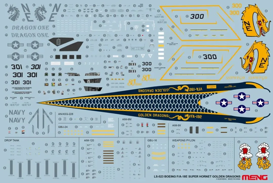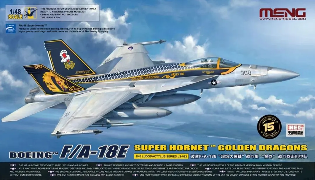 作为成立15周年的重磅献礼,MENG在本届展会特别推出一款飞机限定版套件—LS-023 1/48 波音F/A-18E“超级大黄蜂”战斗机 “金龙”战斗攻击机中队。