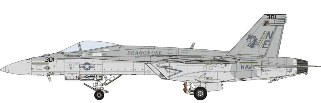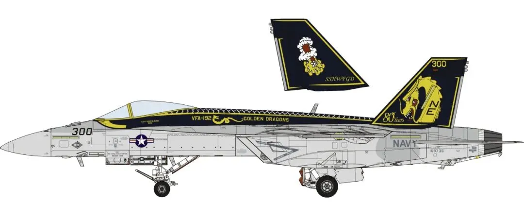 ■ 套件提供的涂装方案A是2025年部署于“卡尔文森”号航空母舰 (CVN 70)的VFA-192“金龙”战斗攻击机中队300号队长机彩绘涂装。机背的龙鳞和垂尾的金龙图案异常醒目。