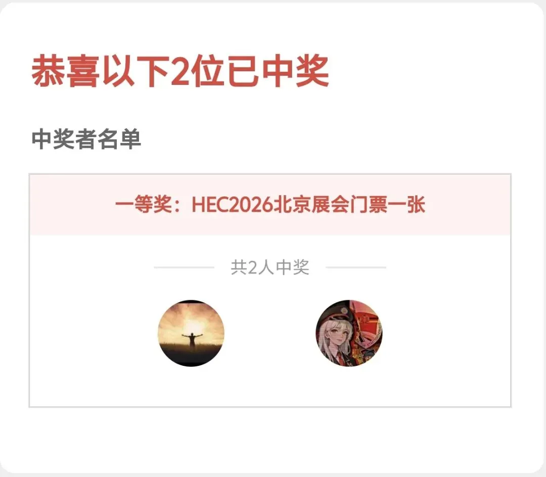 恭喜微信ID名为"台尔曼"和"舞狮迷hj"的两位朋友中奖,我们将各送出一张HEC2026北京展会虚拟门票。请获奖的朋友通过后台私信发送您的姓名和手机号码登记领奖。