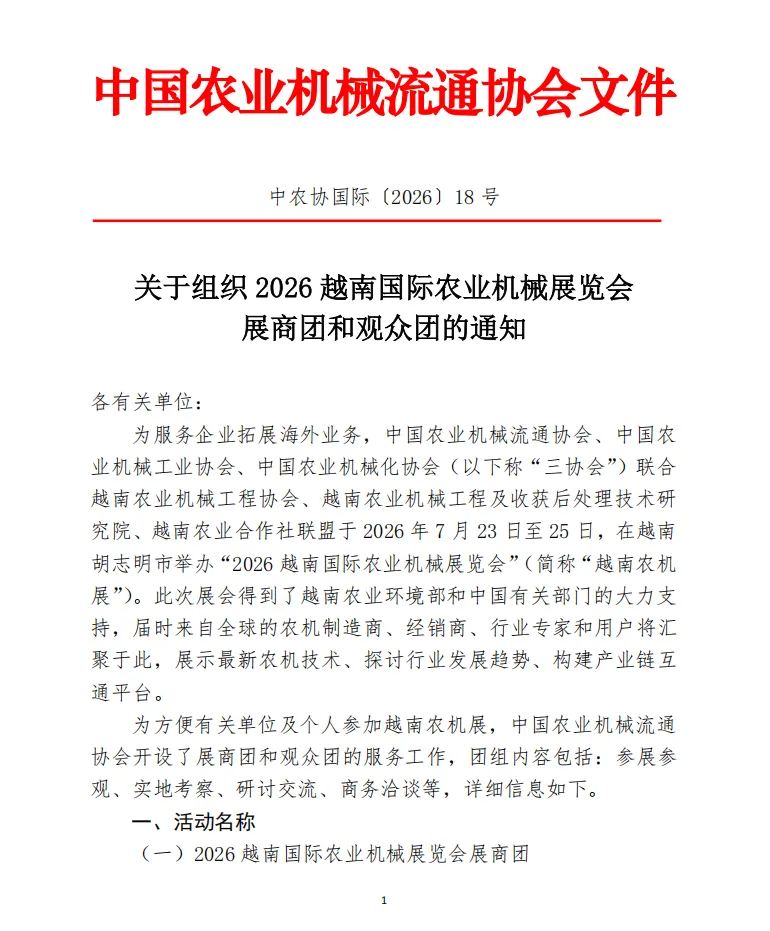 为服务企业拓展海外业务,中国农业机械流通协会、中国农业机械工业协会、中国农业机械化协会(以下称“三协会”)联合越南农业机械工程协会、越南农业机械工程及收获后处理技术研究院、越南农业合作社联盟于2026年7月23日至25日,在越南胡志明市举办“2026越南国际农业机械展览会”(简称“越南农机展”)。此次展会得到了越南农业环境部和中国有关部门的大力支持,届时来自全球的农机制造商、经销商、行业专家和用户将汇聚于此,展示最新农机技术、探讨行业发展趋势、构建产业链互通平台。