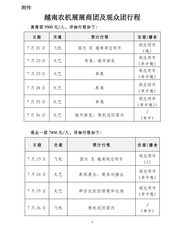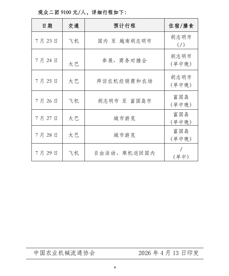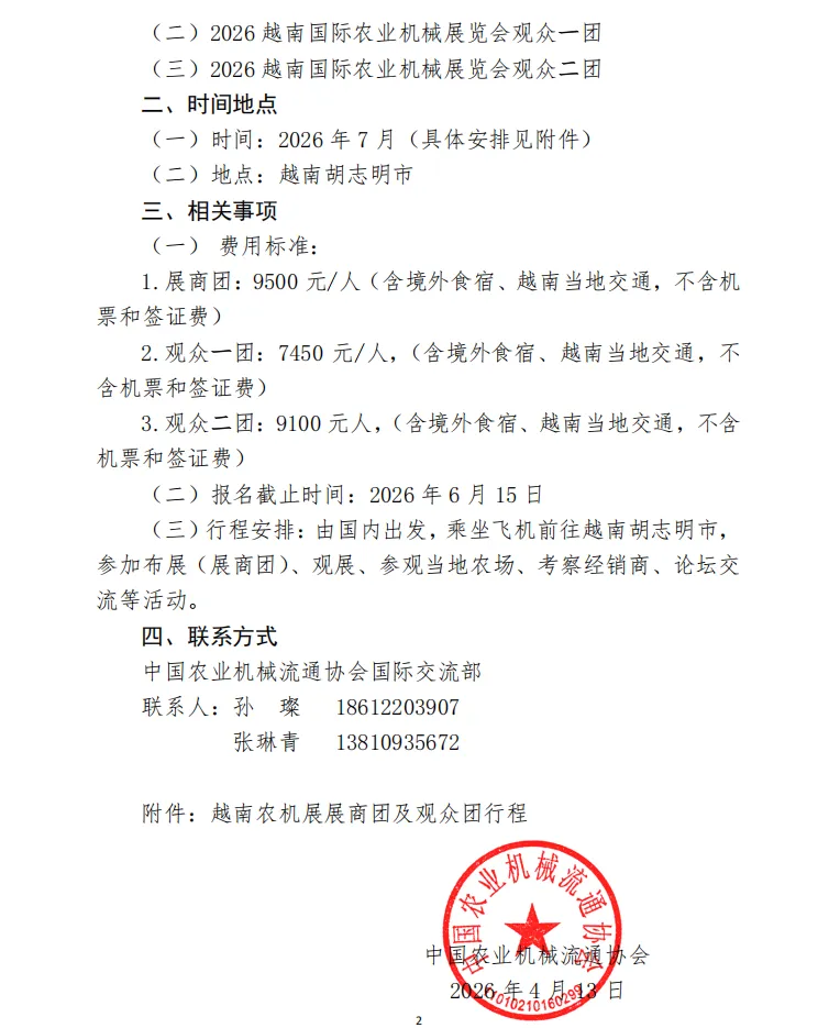 为方便有关单位及个人参加越南农机展,中国农业机械流通协会开设了展商团和观众团的服务工作,团组内容包括:参展参观、实地考察、研讨交流、商务洽谈等,详细信息如下。