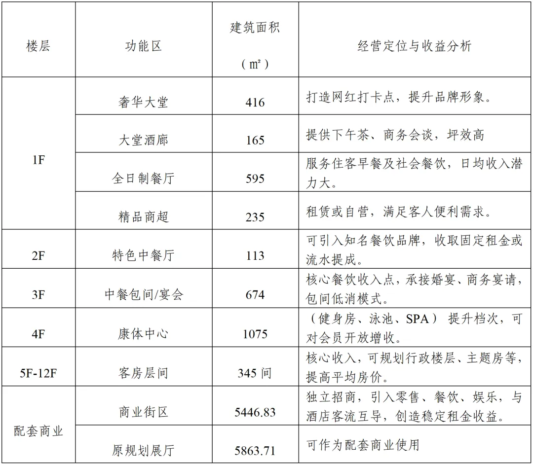 其中:5-12F客房345间,约33571.46㎡,1-4F商业:约11310.54㎡(含配套商业及原规划展厅)