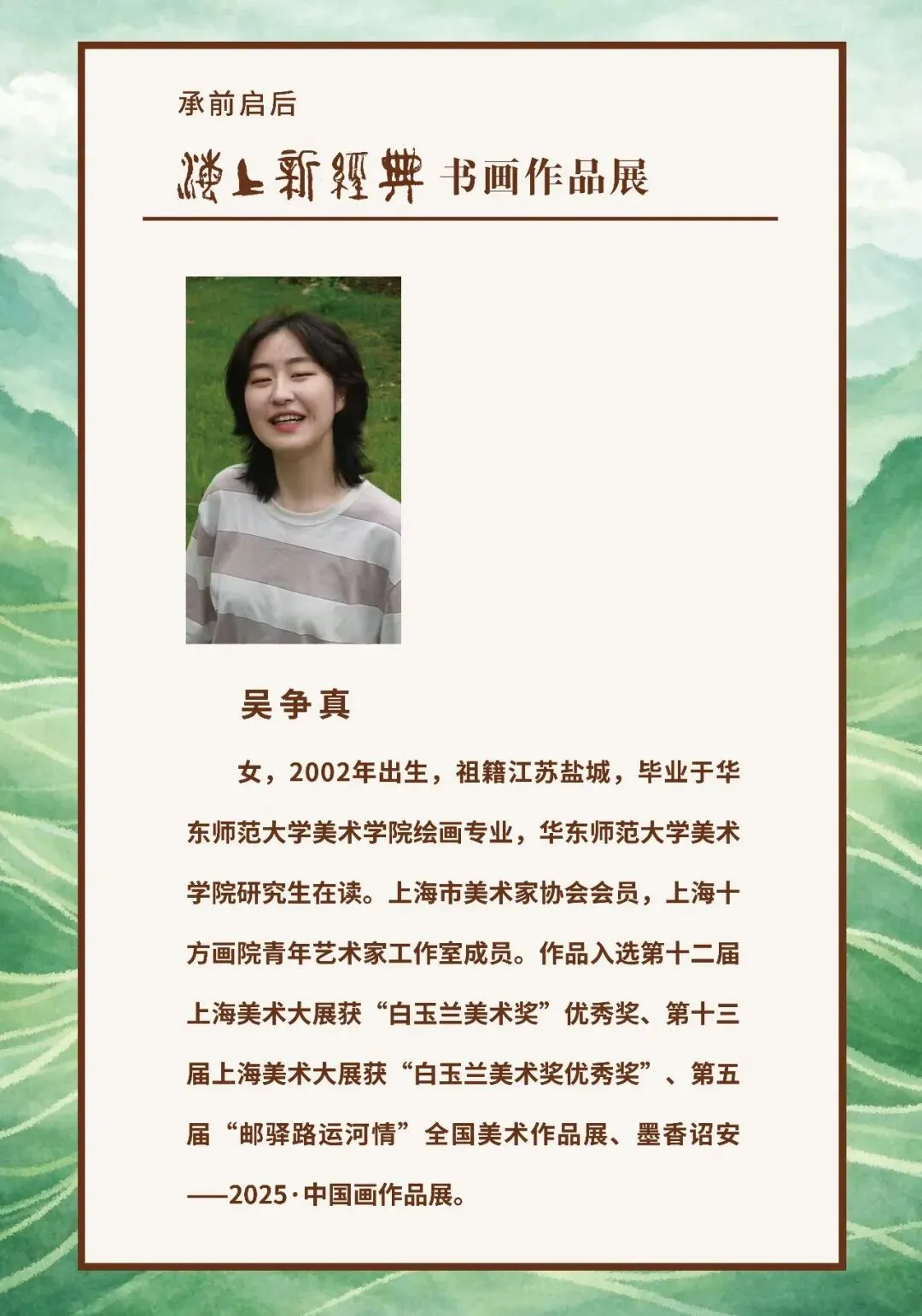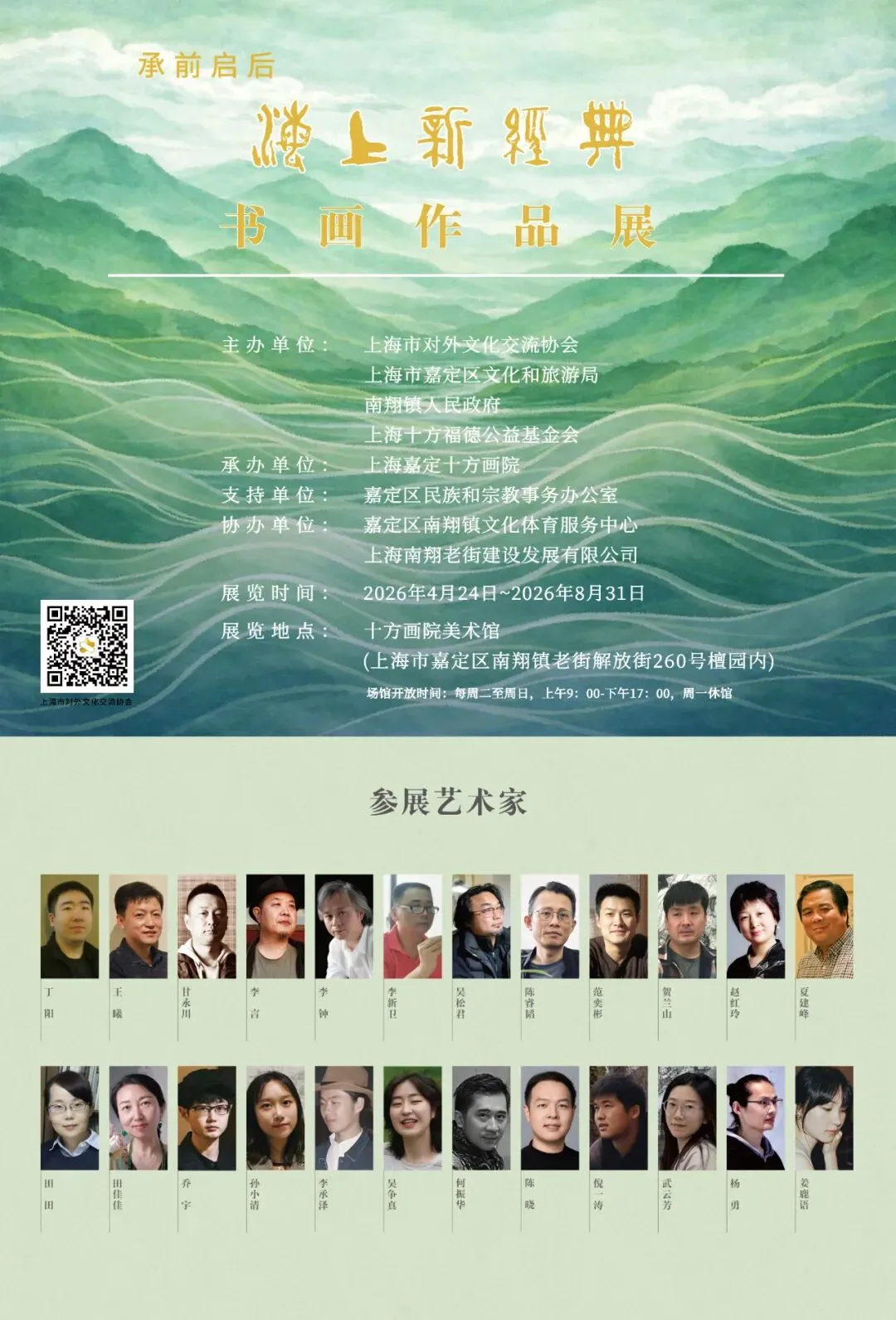 4月24日-8月31日,由上海市对外文化交流协会与上海市嘉定区文化和旅游局、南翔镇人民政府、上海十方福德公益基金会主办,上海嘉定十方画院承办,嘉定区民族和宗教事务办公室支持,嘉定区南翔镇文化体育服务中心、上海南翔老街建设发展有限公司协办的“承前启后——海上新经典书画作品展”在上海十方画院举办。本次展览汇聚当代海派书画新生力量丁阳、王曦、甘永川、李言、李钟、李新卫、吴松君、陈睿韬、范奕彬、贺兰山、赵红岭、夏建峰,以及上海十方画院青年艺术家工作室成员田田、田佳佳、乔宇、孙小清、李承泽、吴争真、何振华、陈晓、倪一涛、武云芳、杨勇、姜鹿语的七十余幅佳作,题材涵盖人物、山水、花鸟、书法,风格既有传统笔墨的厚重典雅,又有融入现代语言和创新手法,这些作品不仅保留了海派艺术的精神内核,更彰显出“笔墨映时代”的鲜明特质。展览作者名单
