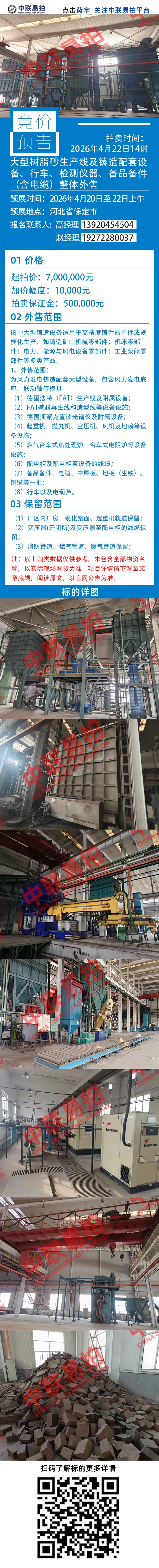 【河北】700万起拍,大型树脂砂生产线及铸造配套设备、行车、检测仪器、备品备件(含电缆)整体外售