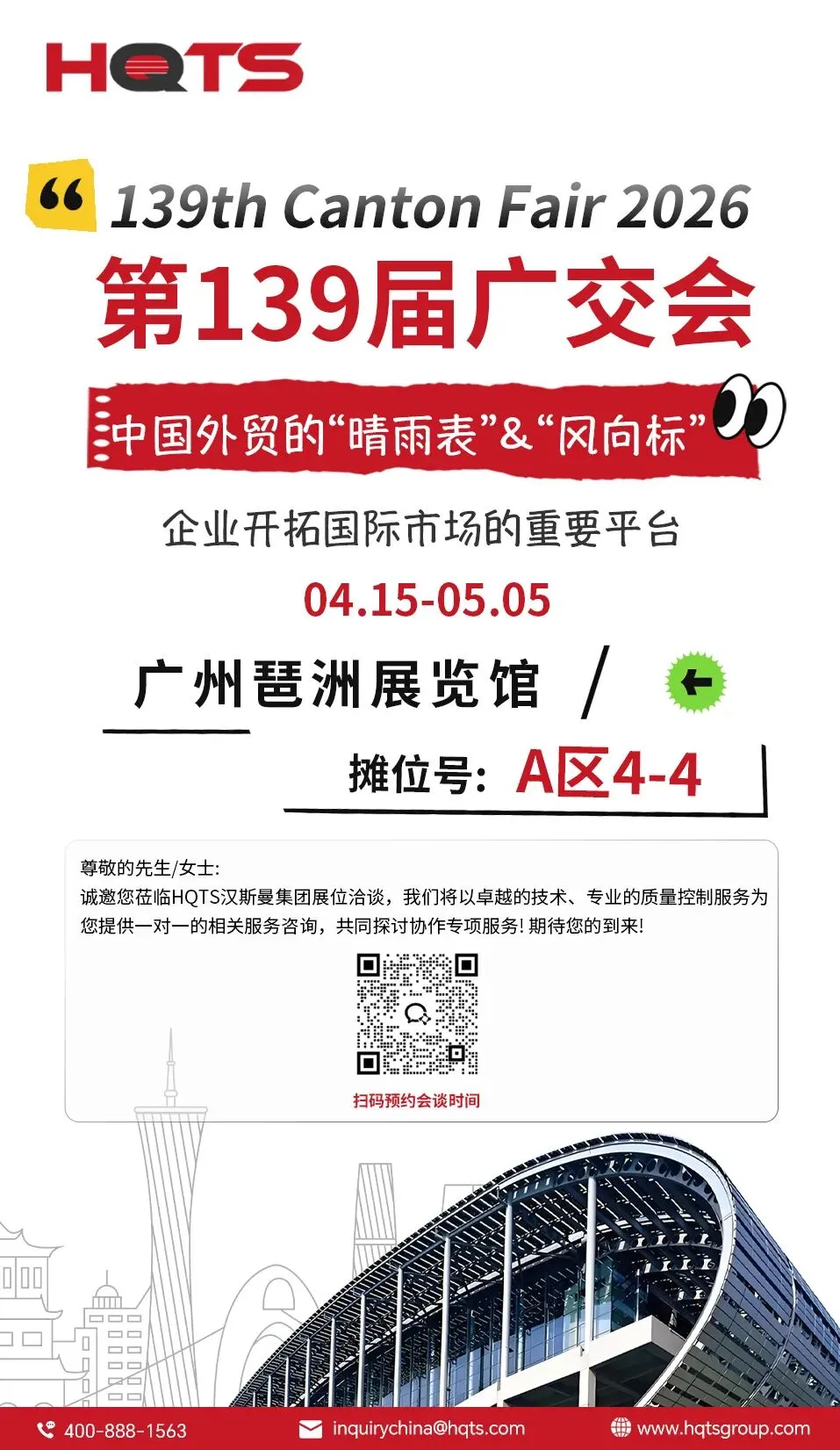 第 139 届广交会,商机涌动,机遇无限。HQTS在广交会等您,携手以专业护航,以合规破局,共拓外贸出海新蓝海,共赢全球贸易新未来!