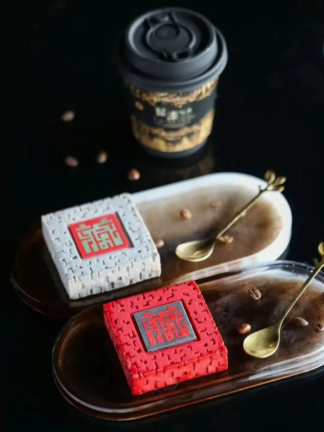 剔犀漆盒(咖啡夹心核桃白巧克力慕斯)、剔红漆盒(树莓夹心巧克力慕斯)