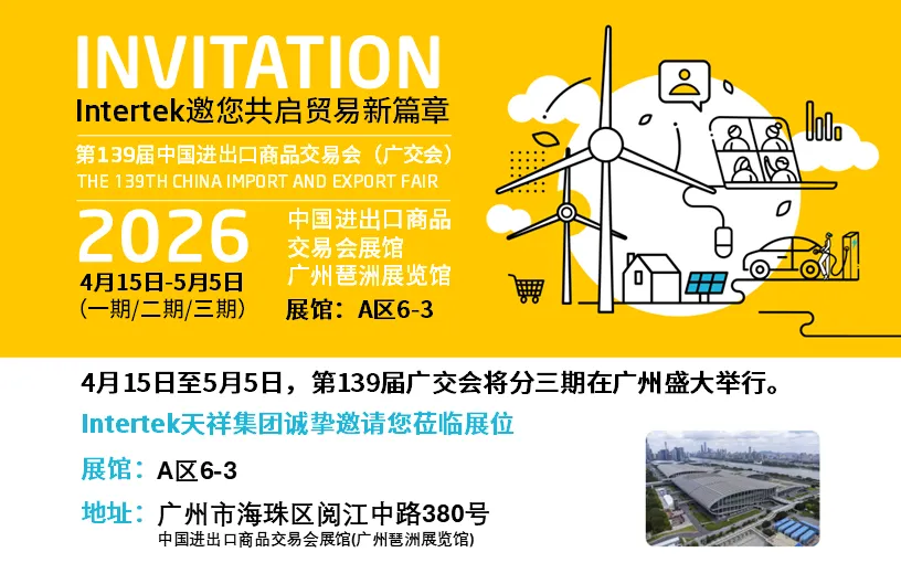 第139届中国进出口商品交易会(广交会),将于4月15日盛大开幕。作为全球规模最大的综合性贸易展览会,广交会持续为全球企业搭建高效合作的平台。Intertek天祥集团将携全面质量保障方案亮相本次盛会,诚邀您莅临展位,面对面交流,共探合作新机遇。