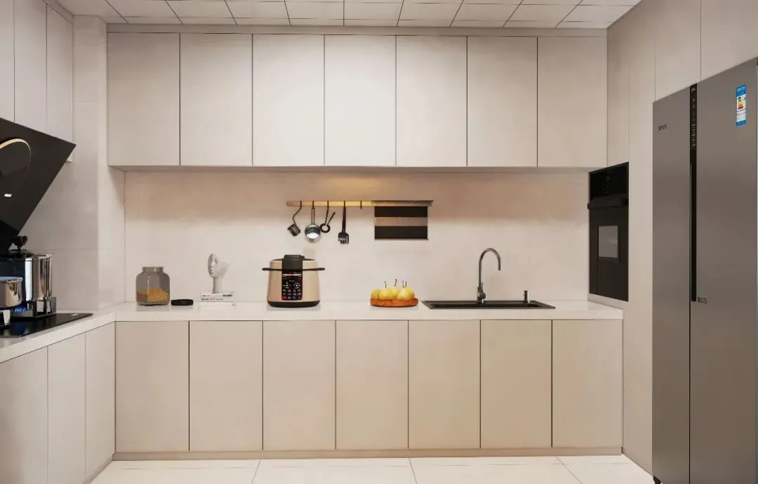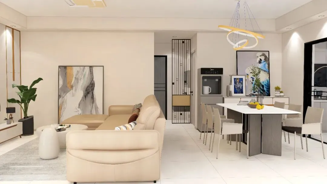 空间布局简洁明快、动线流畅,弱化多余隔断与装饰,最大化保留空间的开阔感与通透度,让日常起居更显舒展自在。色彩搭配温润和谐,选用浅灰色地砖铺陈基底,搭配当下流行的汝窑色墙面,再辅以米黄色真皮沙发提亮空间,整体干净整洁、质感柔和,后期打理也更为省心。在兼顾美观与实用性的同时,着重强化全屋储物功能,精准契合业主忙碌的生活节奏,即便无暇频繁整理,也能让家居环境始终整洁有序。