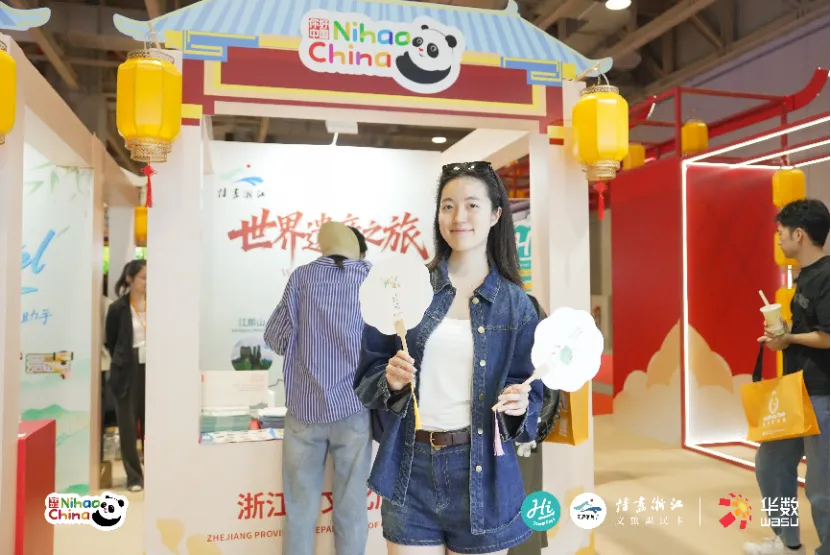 文旅惠民卡展台内,各地游客纷纷参与打卡活动,手持文旅卡纪念团扇合影留念。知名百万粉丝主播“臭臭罗与香香旺”也来到展台,现场体验两大核心产品,用直播镜头让浙江文旅魅力触达更广泛的海外受众。