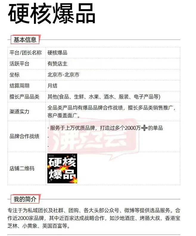 他们专注于为私域团长及社群、团购、各大头部公众号、微博等提供选品服务。合作近2000家品牌,其中近百家达成战略合作——沙地酒庄、烤肠大叔、香港宝芝林、小黄象、英国百富……