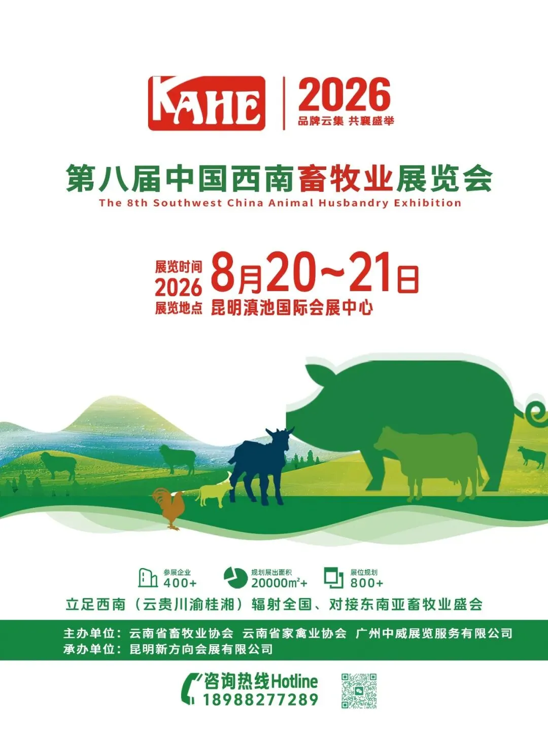 第八届中国西南畜牧业展览会(KAHE 2026)将于2026年8月20日至21日,在昆明滇池国际会展中心再度启幕。本届展会由云南省畜牧业协会、云南省家禽业协会、广州中威展览服务有限公司联合主办,昆明新方向会展有限公司承办。展会以“智慧畜牧·绿色转型·全球联动”为主题,汇聚畜牧养殖全产业链核心产品与创新技术,搭建集产品展示、行业交流、技术分享、商贸合作于一体的综合性战略平台。持续打造立足西南、辐射全国、对接东南亚的畜牧业盛会。为促进行业深度对话与成果共享,展会期间举办多场高端活动,将汇集行业专家教授,深入探讨行业当前面临的热点、痛点与难点议题,为参展企业、规模养殖场户、经销商及代理商搭建一个高效务实的交流平台,共探趋势、共享成果、共谋发展。组委会诚挚邀请全球畜牧业领域的专家学者、企业代表、从业者莅临春城昆明参展参会,共襄此次畜牧行业的年度盛举,携手共创畜牧业更加美好的未来!