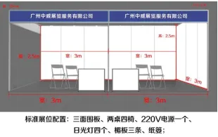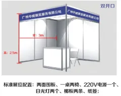 ①标准展位包含三面围板、一桌两椅、楣板、照明、电源;