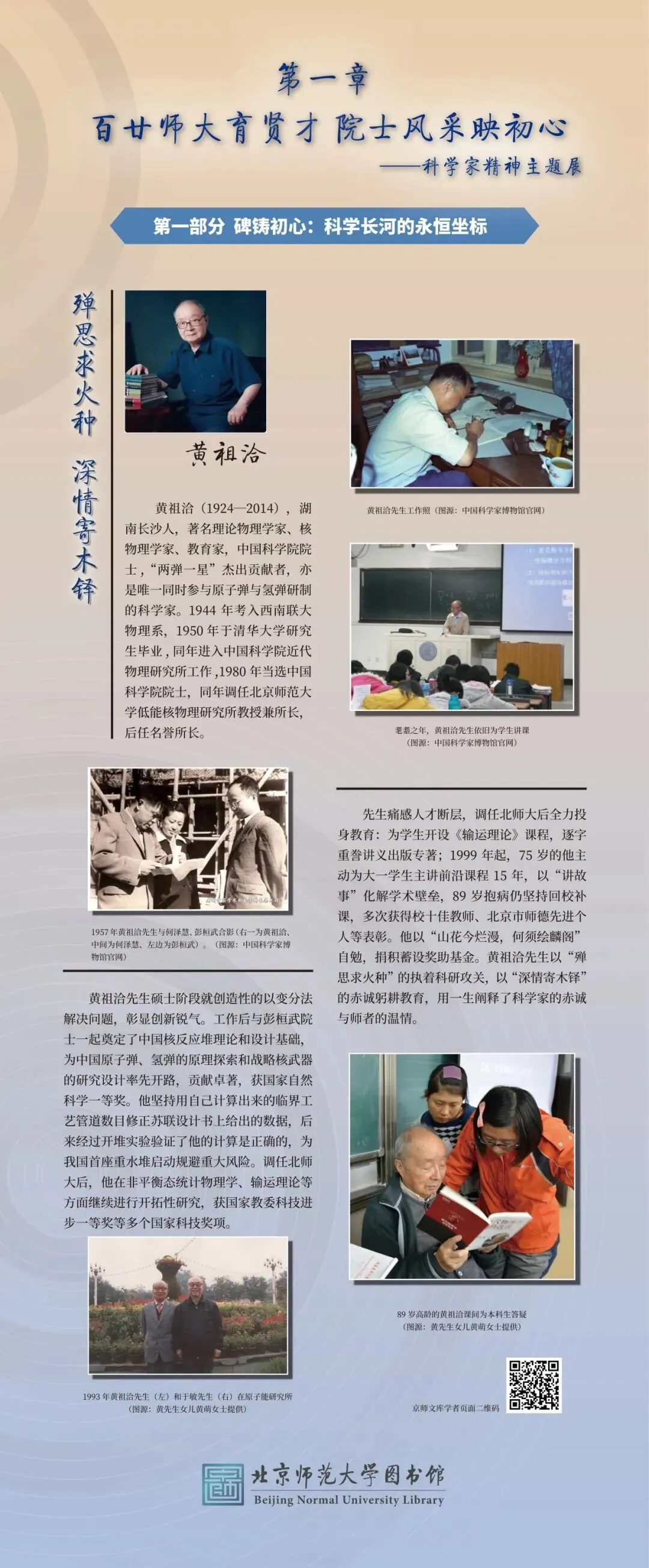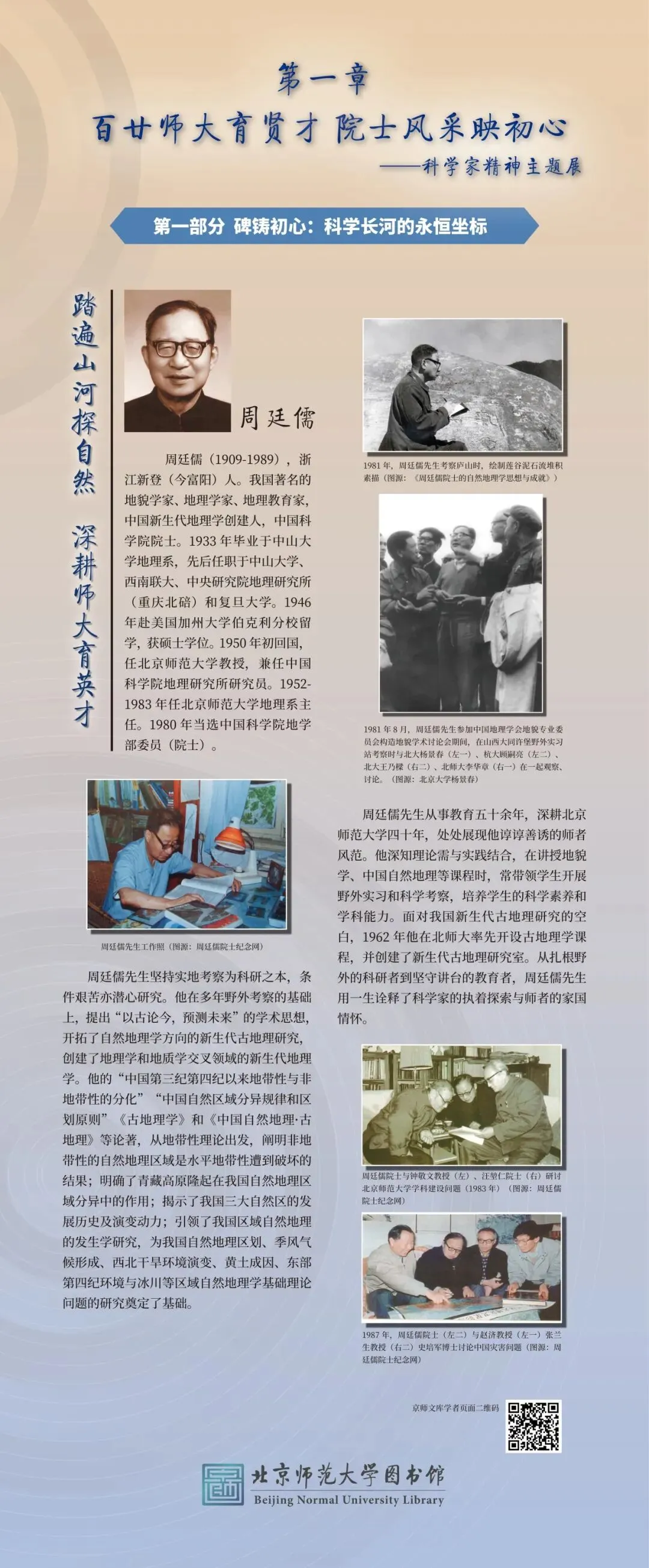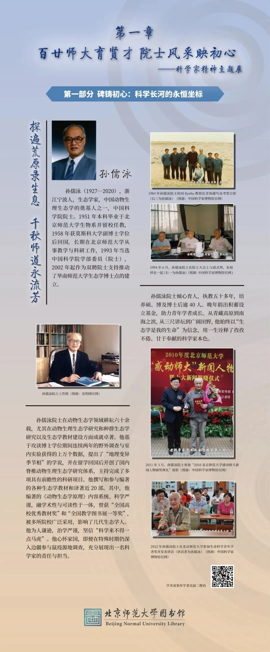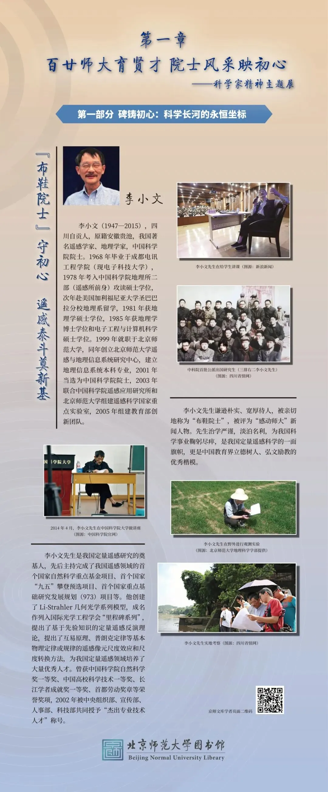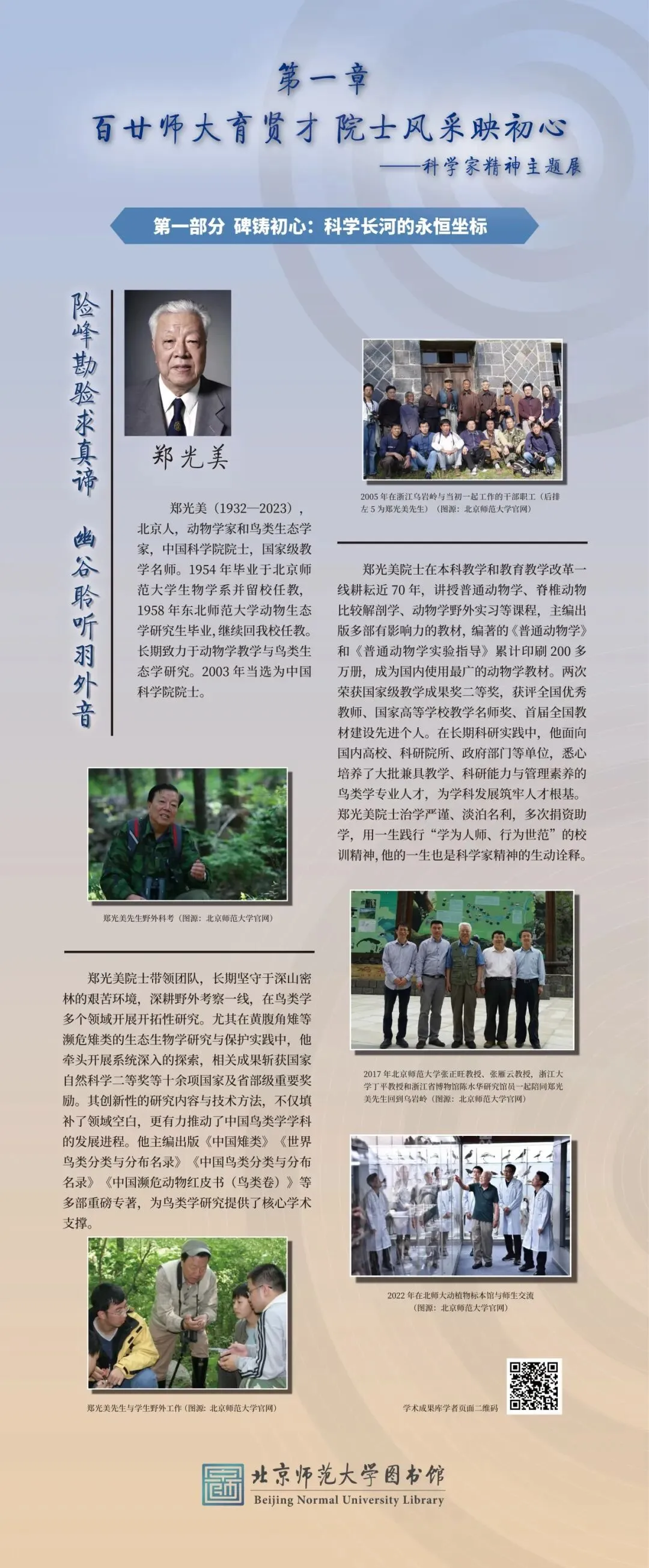 本次展览的圆满呈现,离不开多方鼎力襄助与深情付出。衷心感谢北京师范大学副校长汪明与图书馆馆长王显芳的统筹策划,为展览筑牢根基、指明方向;感恩各方渠道提供的珍贵史料,为还原学者风采、彰显精神内核提供了坚实支撑;致谢相关院系的热忱联络与通力协作,让每一份事迹都得以完整呈现;更要向院士本人、家属、弟子及所在院系致以诚挚敬意,他们以严谨之心悉心审核、以热忱之情补充完善,让每一个故事都经得起时光检验,每一段精神都传递得真切动人。谨此向所有为展览付出心力的师长与同仁,致以最诚挚的谢忱。