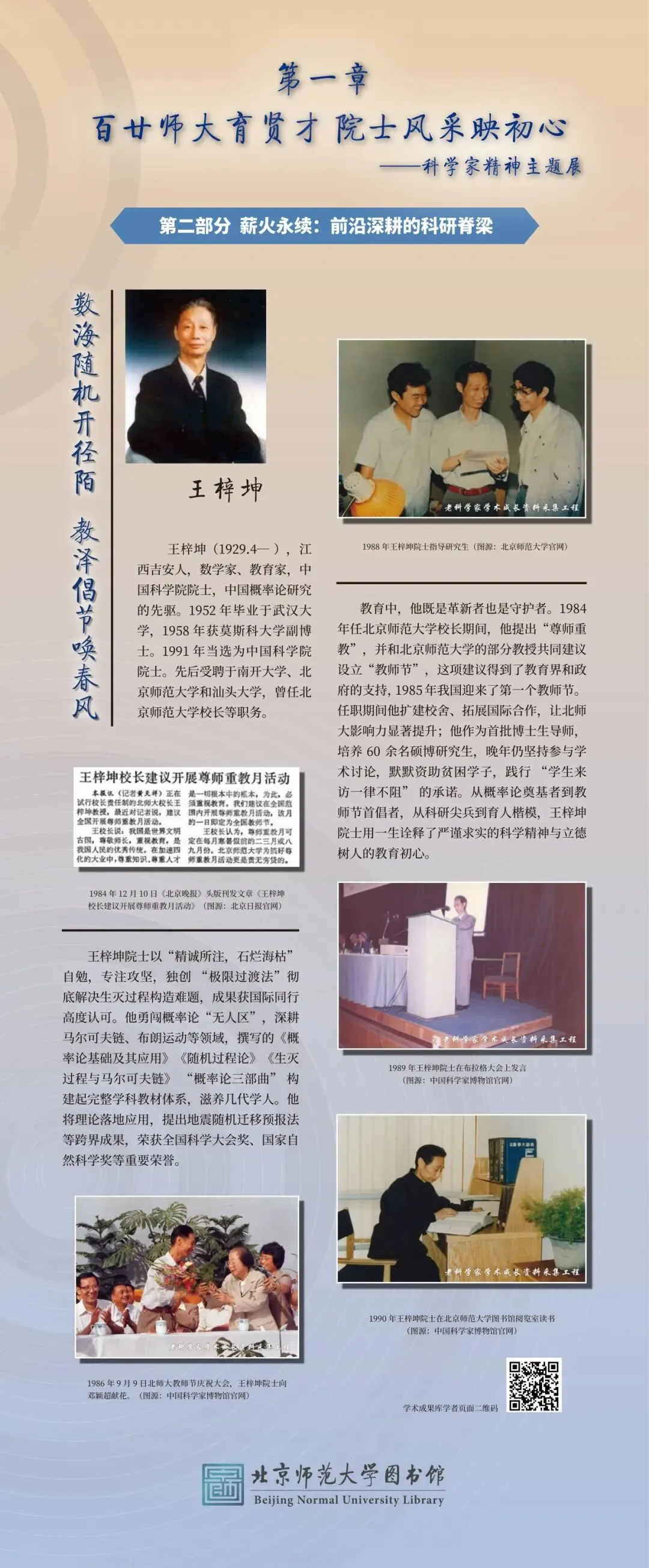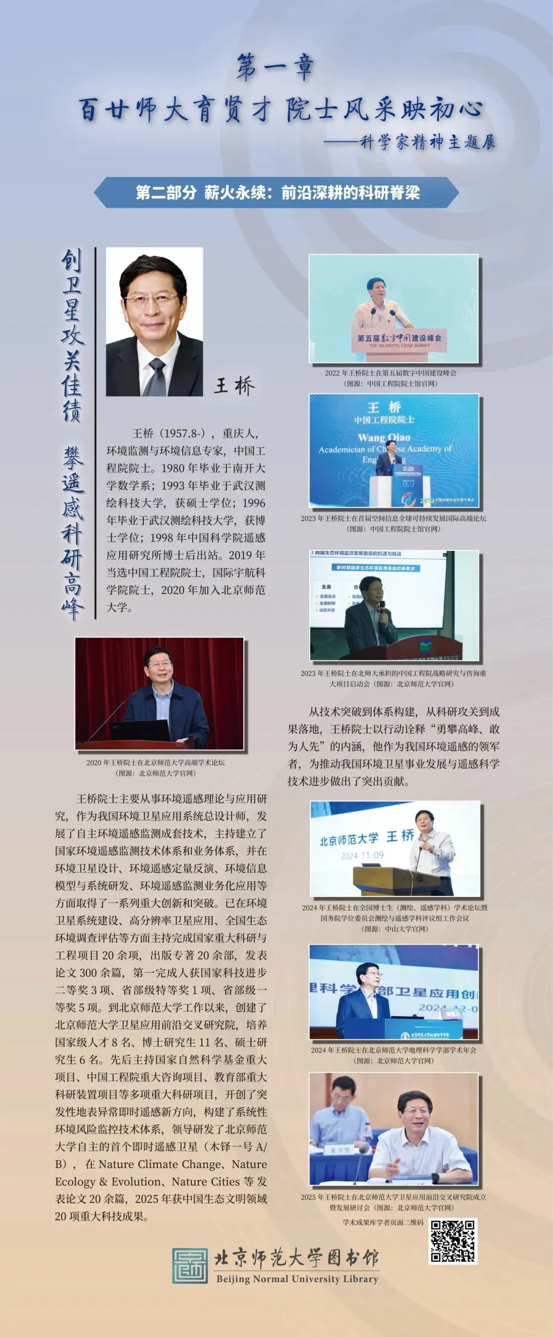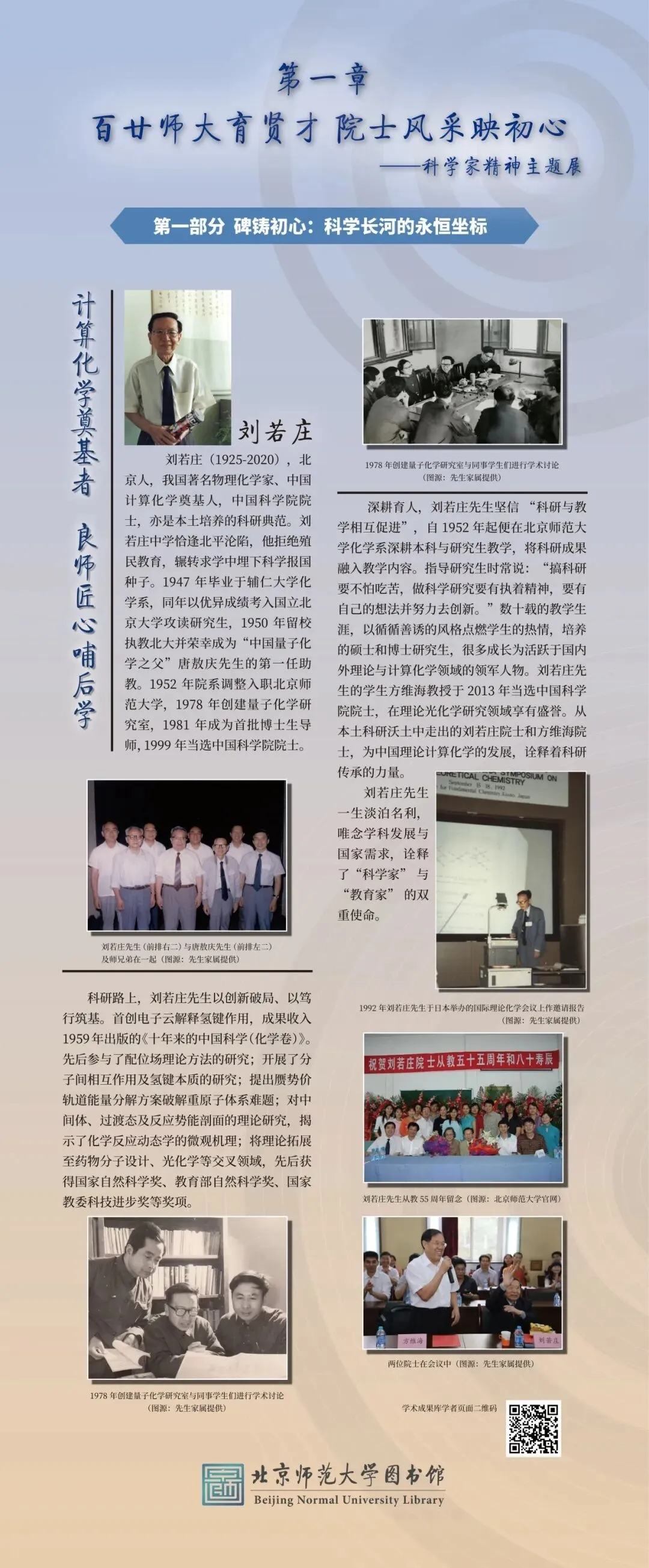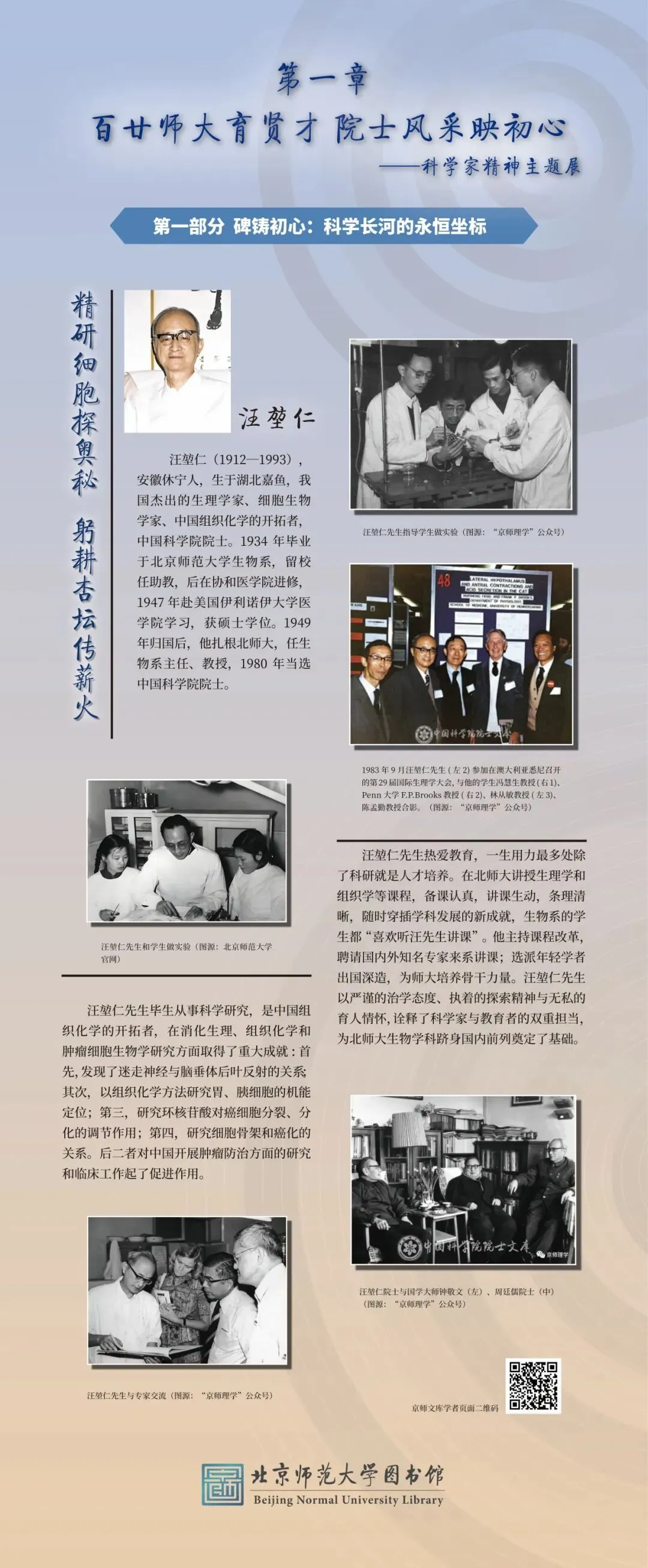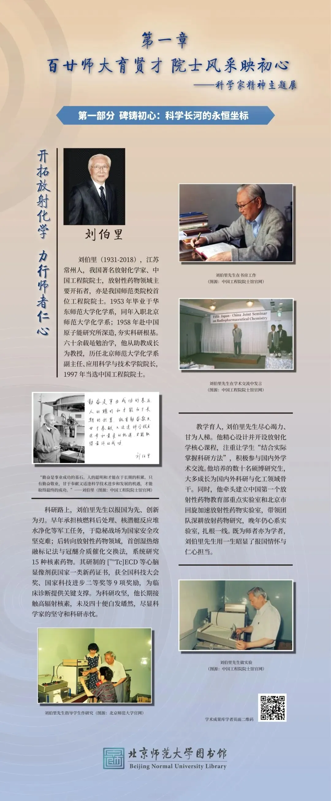 为大力弘扬科学家精神、彰显百廿师大科研底蕴,图书馆举办“百廿师大传薪火 科创赋能续华章”主题展览。展览以北师大院士群体为代表,走进北师大科学家的科研人生,沉浸式体悟科学家精神的深厚内涵,同时依托图书馆研制的《北京师范大学学术影响力动态专报》,展示我校科研成果与学术影响力,以新时代的科研实践,践行百廿学府的治学初心与科创担当。
