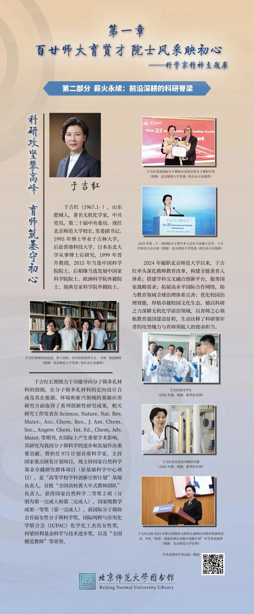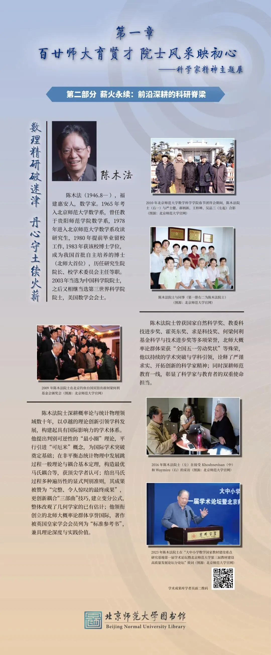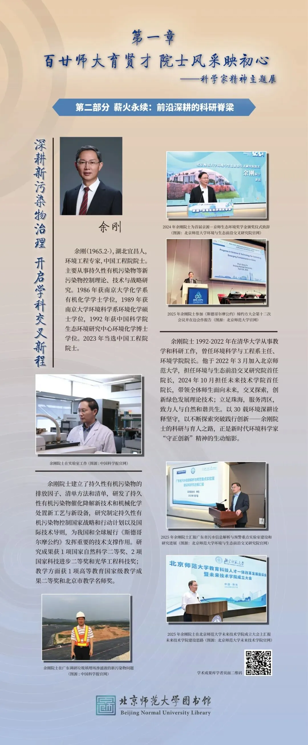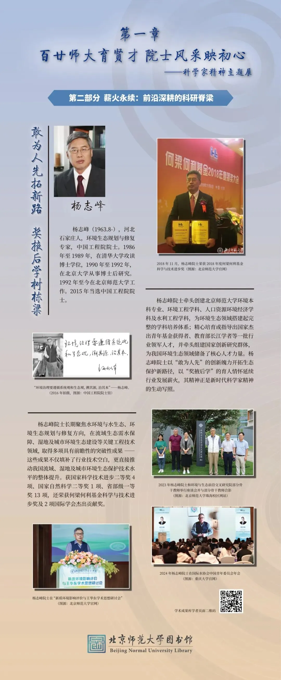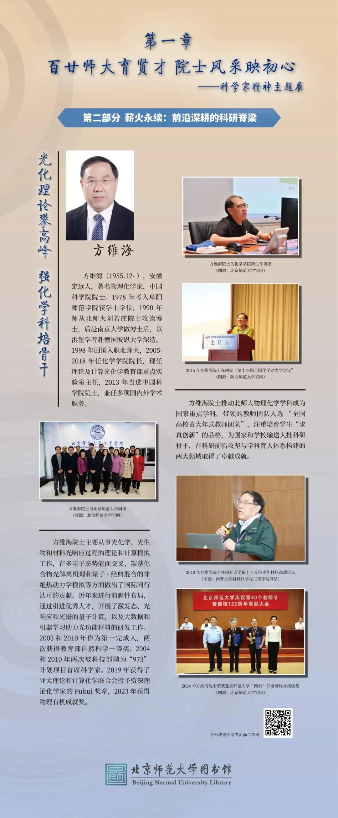 为大力弘扬科学家精神、彰显百廿师大科研底蕴,图书馆举办“百廿师大传薪火 科创赋能续华章”主题展览。展览以北师大院士群体为代表,走进北师大科学家的科研人生,沉浸式体悟科学家精神的深厚内涵,同时依托图书馆研制的《北京师范大学学术影响力动态专报》,展示我校科研成果与学术影响力,以新时代的科研实践,践行百廿学府的治学初心与科创担当。