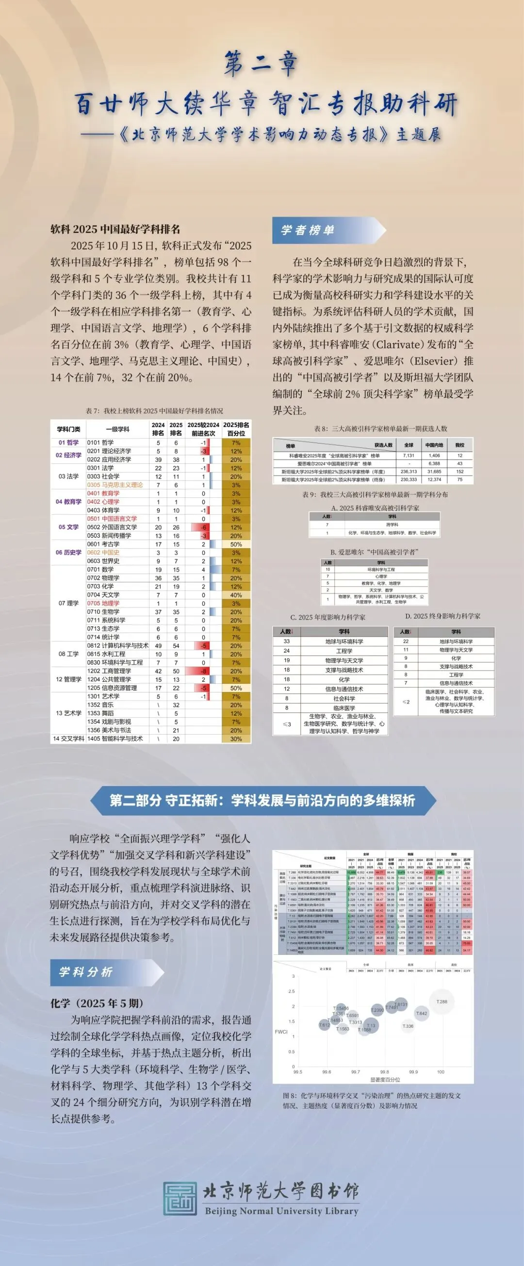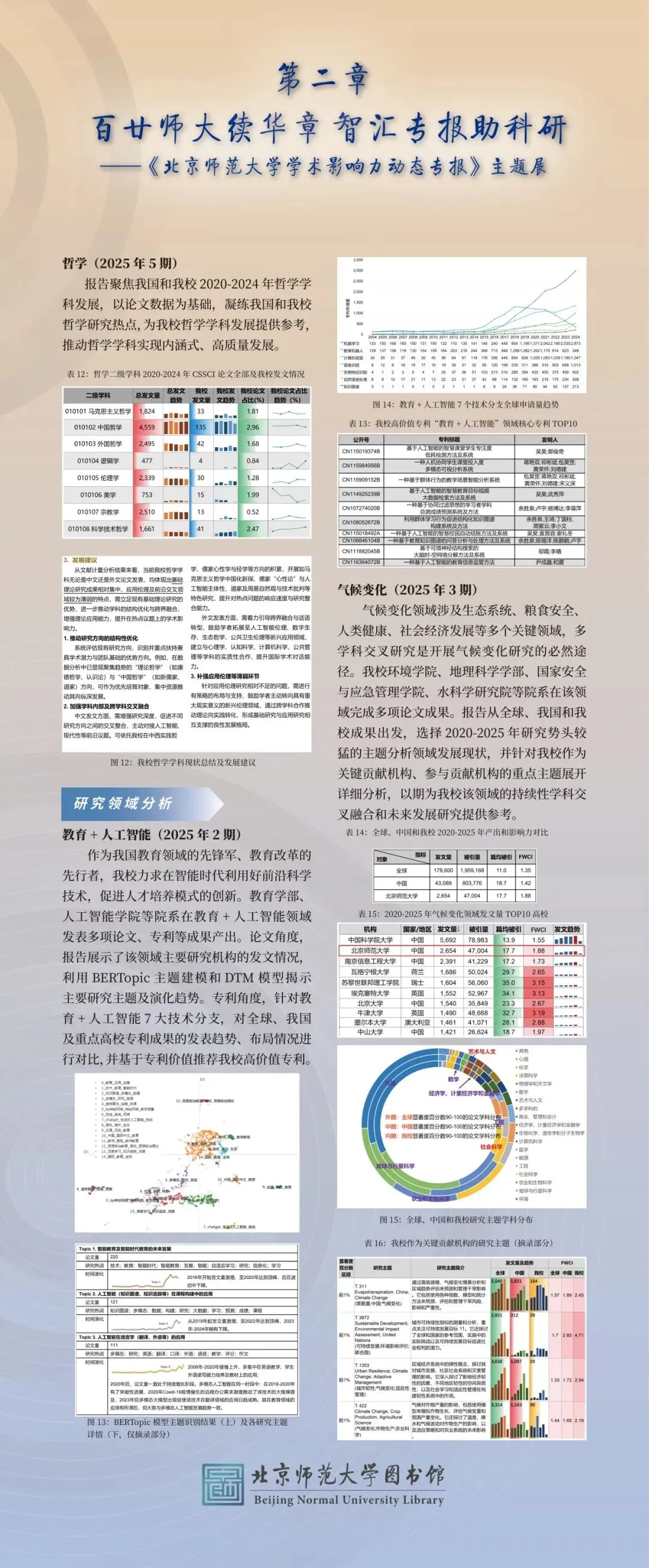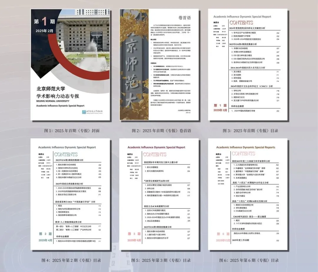 当前,“双一流”建设深化推进,学科交叉融合发展目标明确。为全方位聚焦我校国内外学术影响力、展示科研成果与创新突破,以全球科学热点趋势推动学科前沿交叉发展,图书馆依托自身专业情报搜集与分析能力,于2025年精心打造并推出《北京师范大学学术影响力动态专报》,内容紧扣我校科研决策核心需求,始终与学校学科发展目标同频。每两月一期,每期设3-6个主题,内容随学术动态调整,深入数据挖掘问题,提供“量身定制”的决策参考,助力学校学科发展与影响力提升。2025年总计完成6期。内容聚焦于: