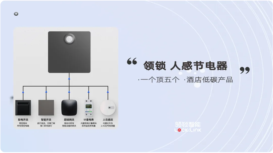 本次展会,领锁智能将重点展示酒店行业唯一主打静音的“LS02酒店静音锁”以及自研首创、功能五合一的人感节电器。