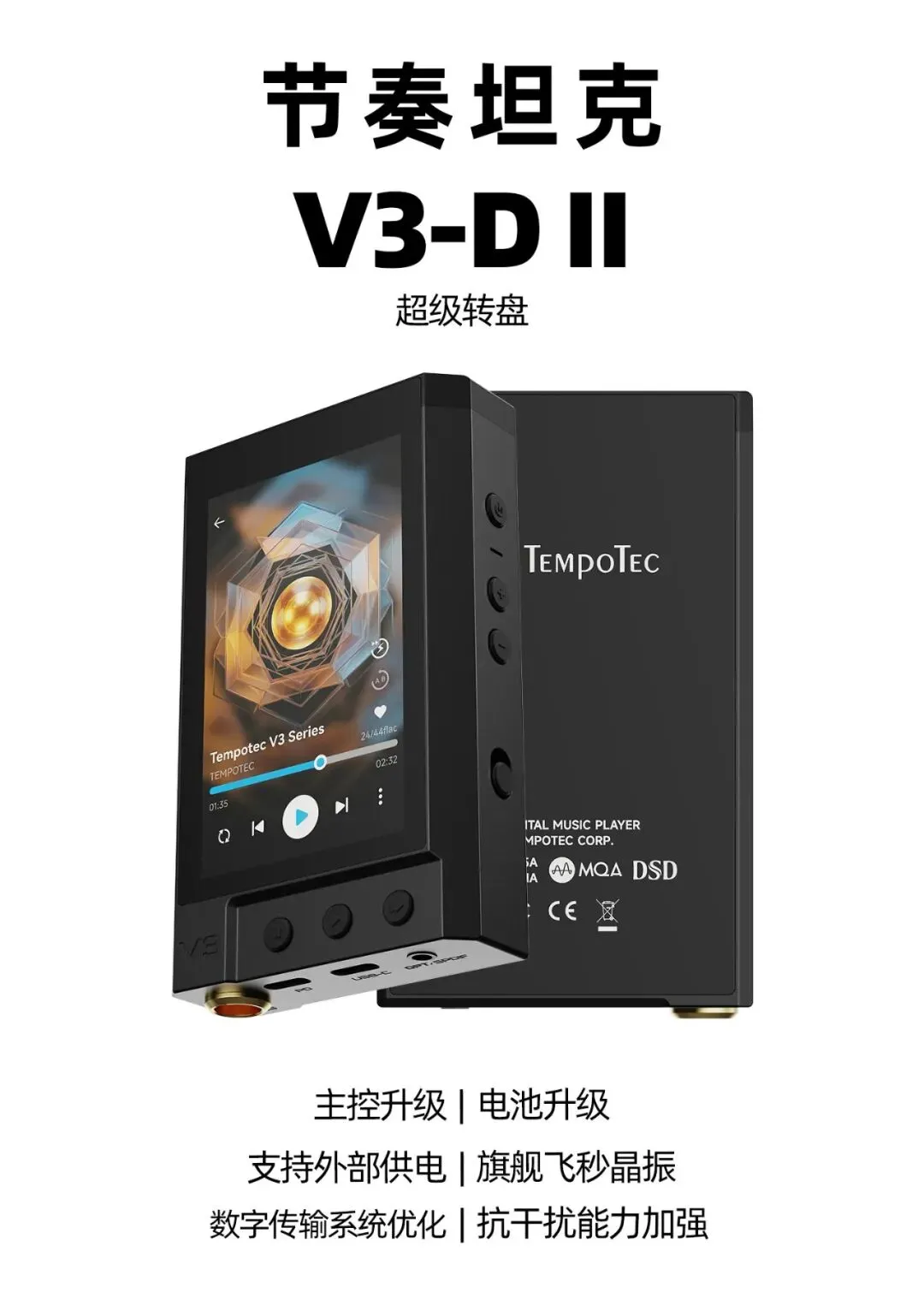 V3-D II 是 节奏坦克(TempoTec) 旗下超级转盘V3-D的迭代,V3-D II 采用了更高级的主控芯片、升级了飞秒级旗舰晶振、支持外部供电、更大的电池容量,并进一步对数字信号传输系统进行了优化,提升了全方位抗干扰的能力,样机首次参展,敬请期待。