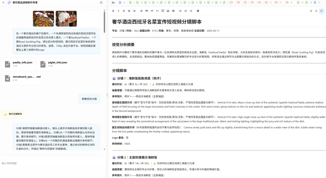 DOSSM基于内置深度行业Know-How的SKILL,自动分析上传图片及要求,生成专业的创意脚本。
