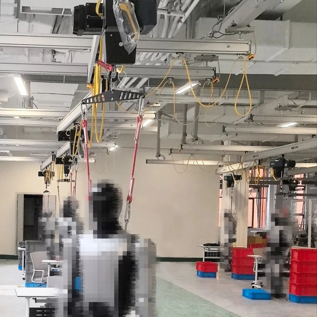 与传统起重设备不同,浙江金轴这套辅助系统搭载了自跟随模块。它不再需要人工遥控,而是能够主动感知人形机器人的运动意图,实时保持最佳跟随距离,真正做到“人形机器人走到哪里,起重系统就跟到哪里”。同时,它又不干涉机器人的自然步态与动作自由度,让研发人员可以获取最真实、最完整的运动数据。