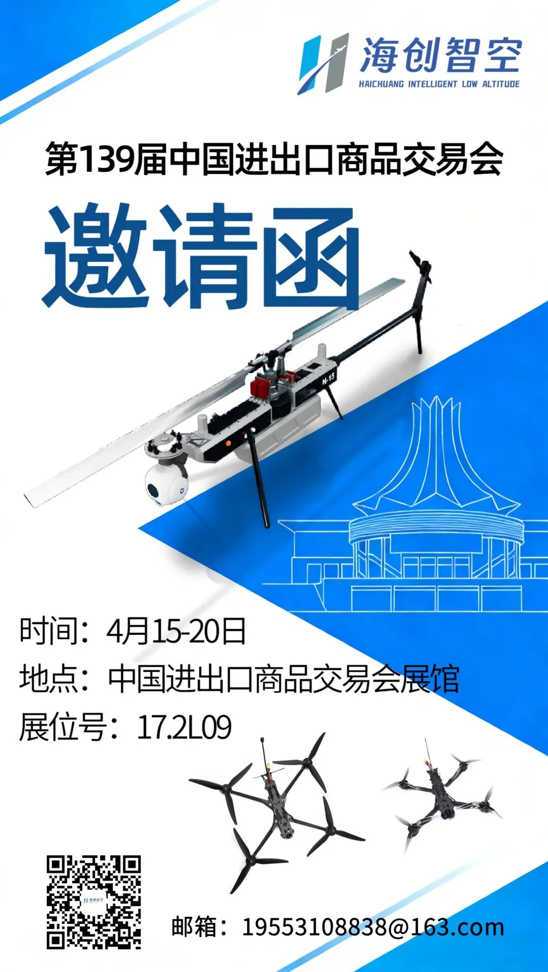 第139届中国进出口商品交易会(广交会)将于4月15日至5月5日盛大开幕,本次展会首设消费级无人机展区,海创智空(山东)信息技术有限公司作为首批无人机企业亮相广交会。