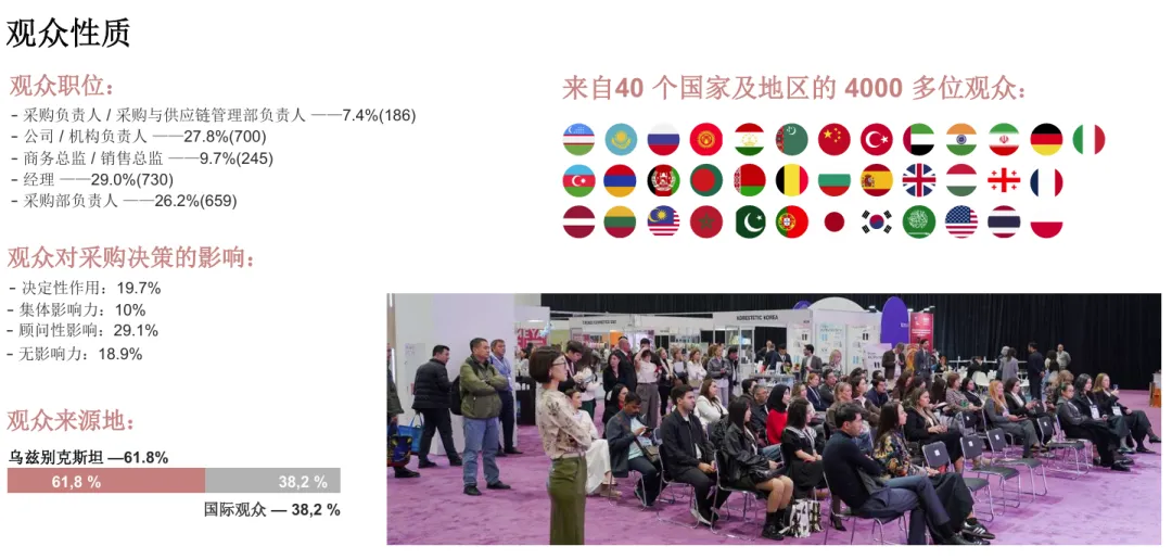 2026年展会将更大规模,将汇聚来自10多个国家的200多家国际和本地展商。展会将提供丰富的商业项目、专家主导的大师班和独特的交流机会。中亚美容行业增长迅速,市场潜力巨大,展会将吸引行业决策者、美发店和水疗中心老板、美容零售商和分销商等专业观众。展会覆盖化妆品、护肤品、香水、美发设备、美甲护理、水疗与健康、有机美容等多个领域,为展商提供拓展业务、建立品牌和寻找新合作伙伴的绝佳平台。