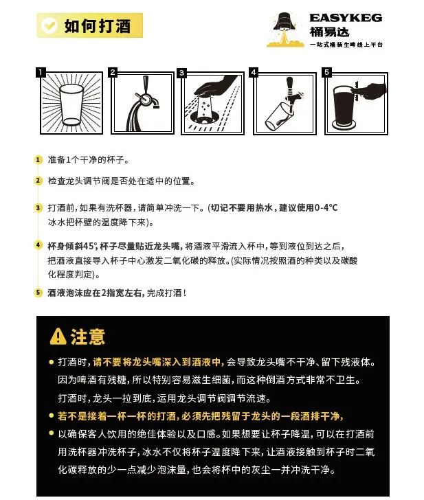 桶装精酿啤酒需要在使用前进行消毒和清洗等处理,以确保啤酒的卫生安全。同时,对于酒吧来说,需要严格控制酒桶的温度、定期清洗打酒设备、调整压力参数等,以避免啤酒变质和污染以及操作不当引发的安全事故。如温度不当,造成桶内二发,连接分配器引发酒矛脱落甚至爆桶