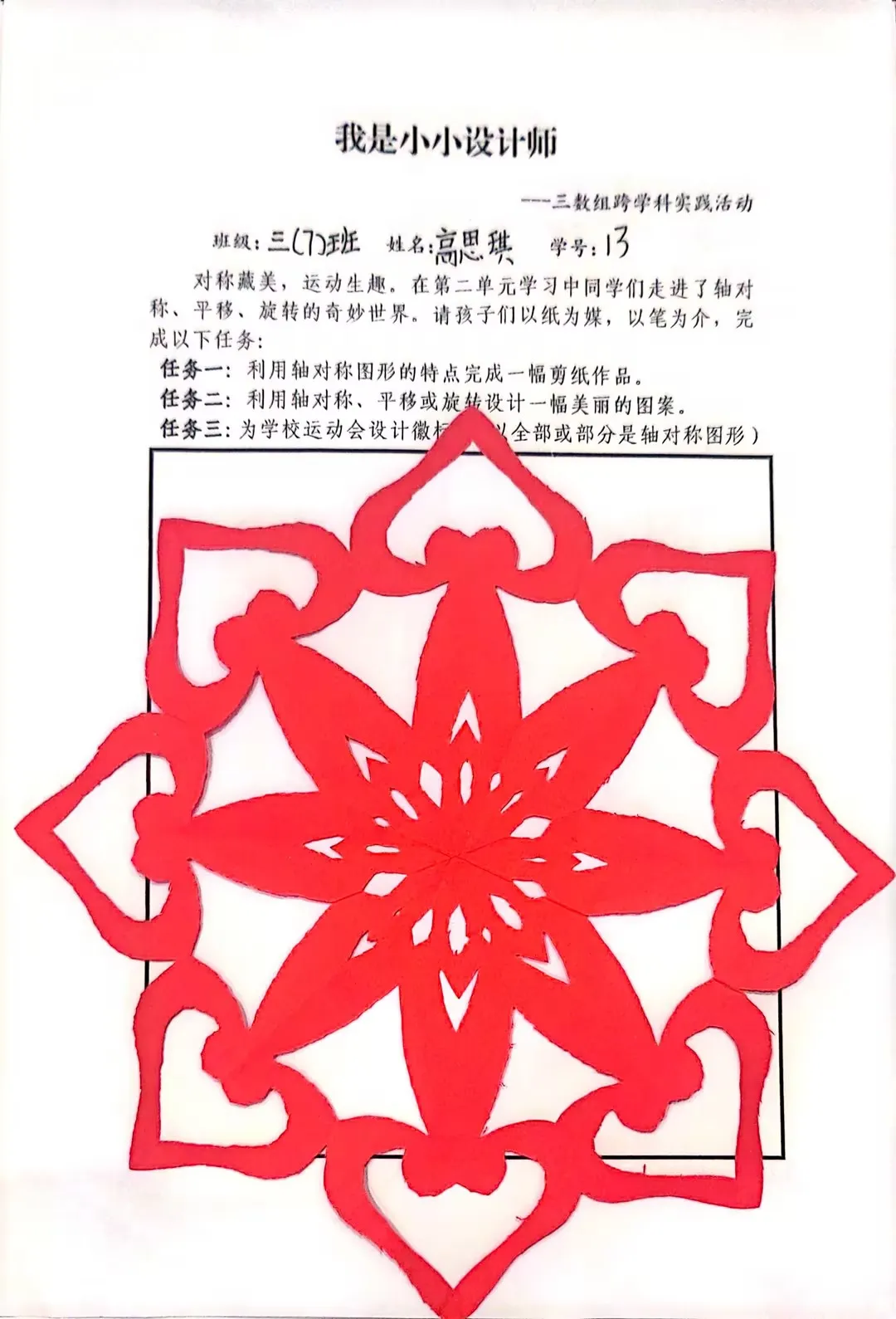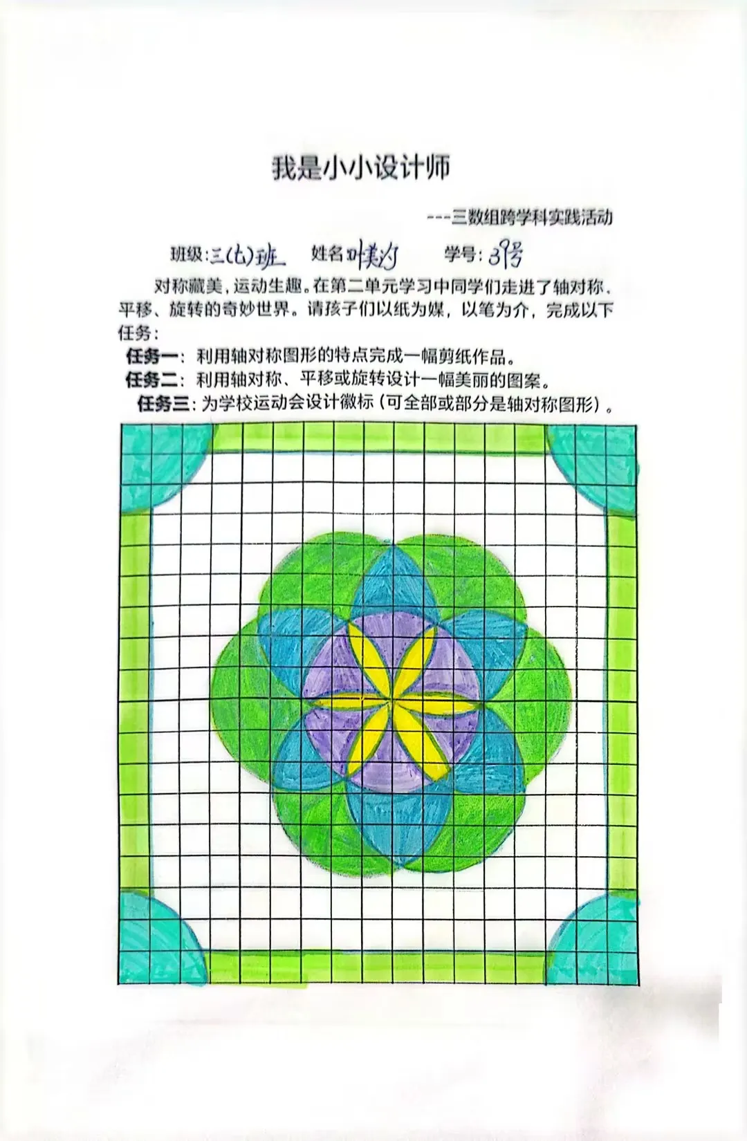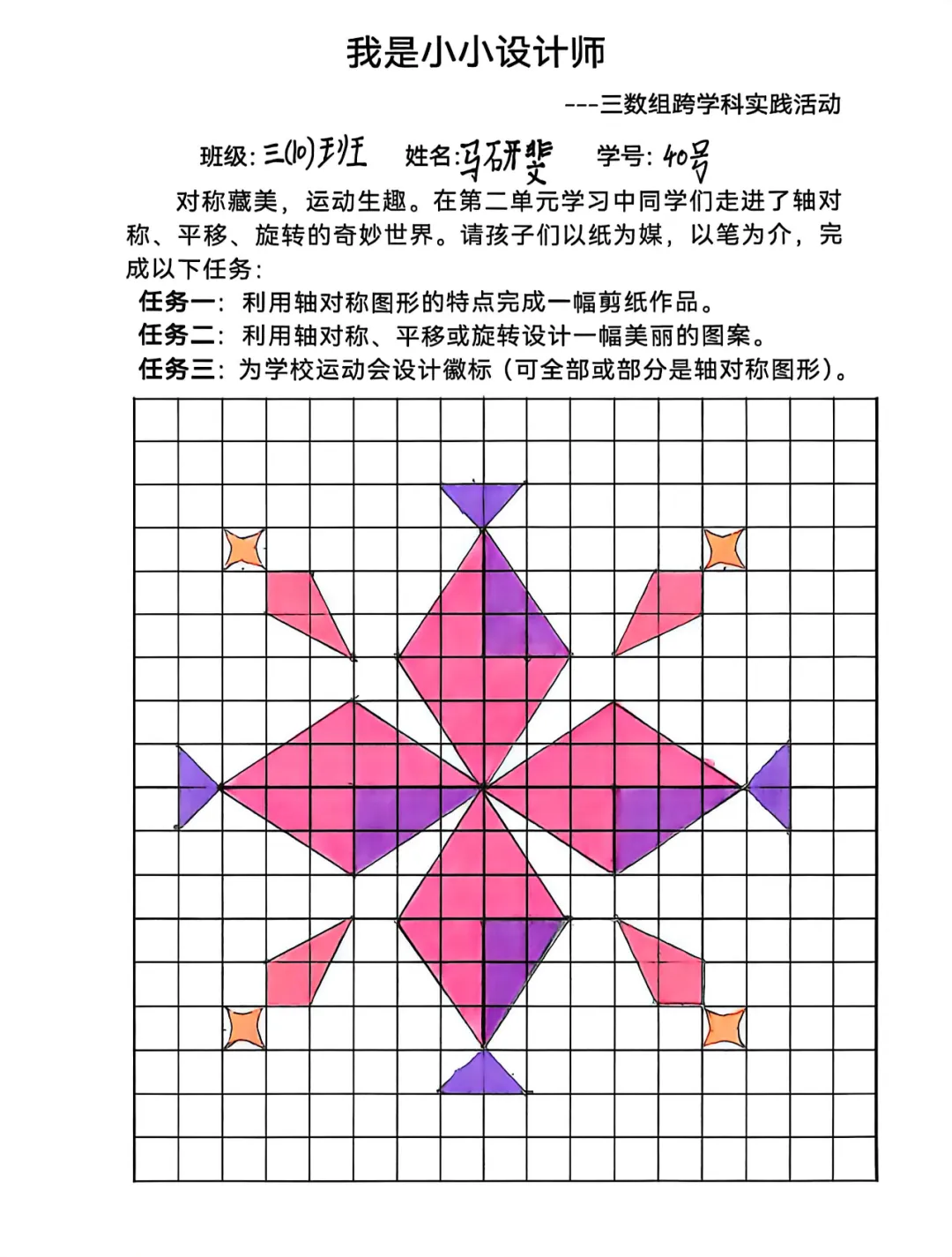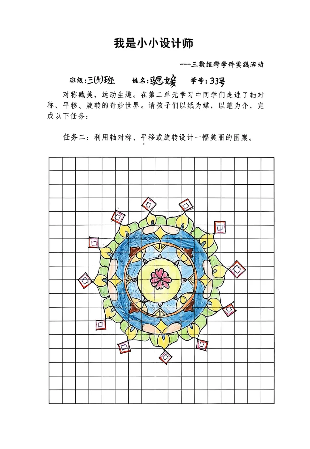 当数学遇上创意,会碰撞出怎样的火花?为帮助学生深入理解轴对称、平移、旋转的数学知识,感受数学与生活、艺术的紧密联系,宝鸡高新第二小学三年级数学学科开展了 “我是小小设计师” 为主题的跨学科实践活动。孩子们以纸为媒、以笔为介,在动手创作中沉浸式体验数学之美,用创意与巧手呈现出精彩纷呈的学习成果。