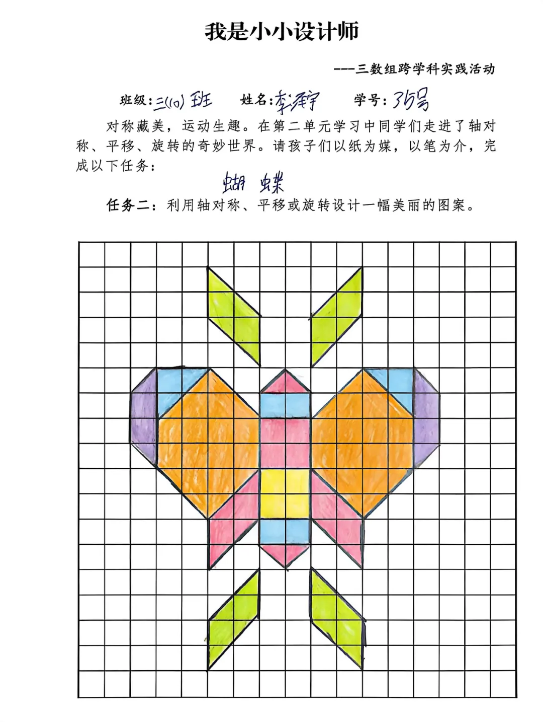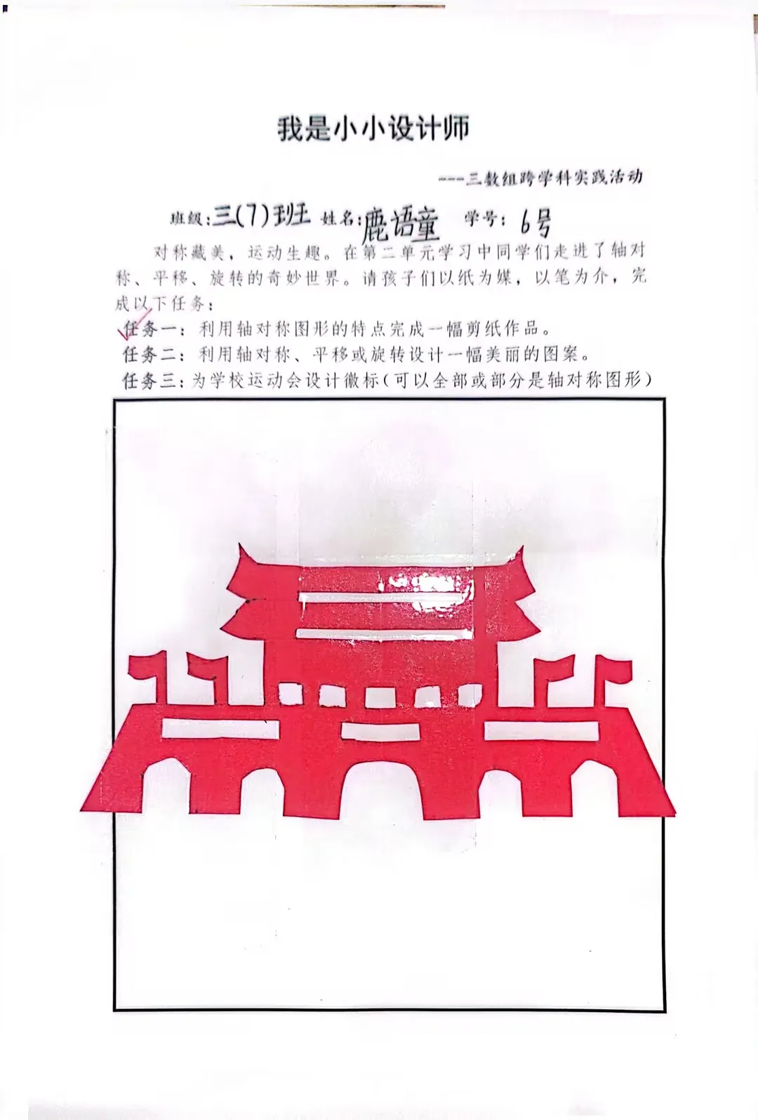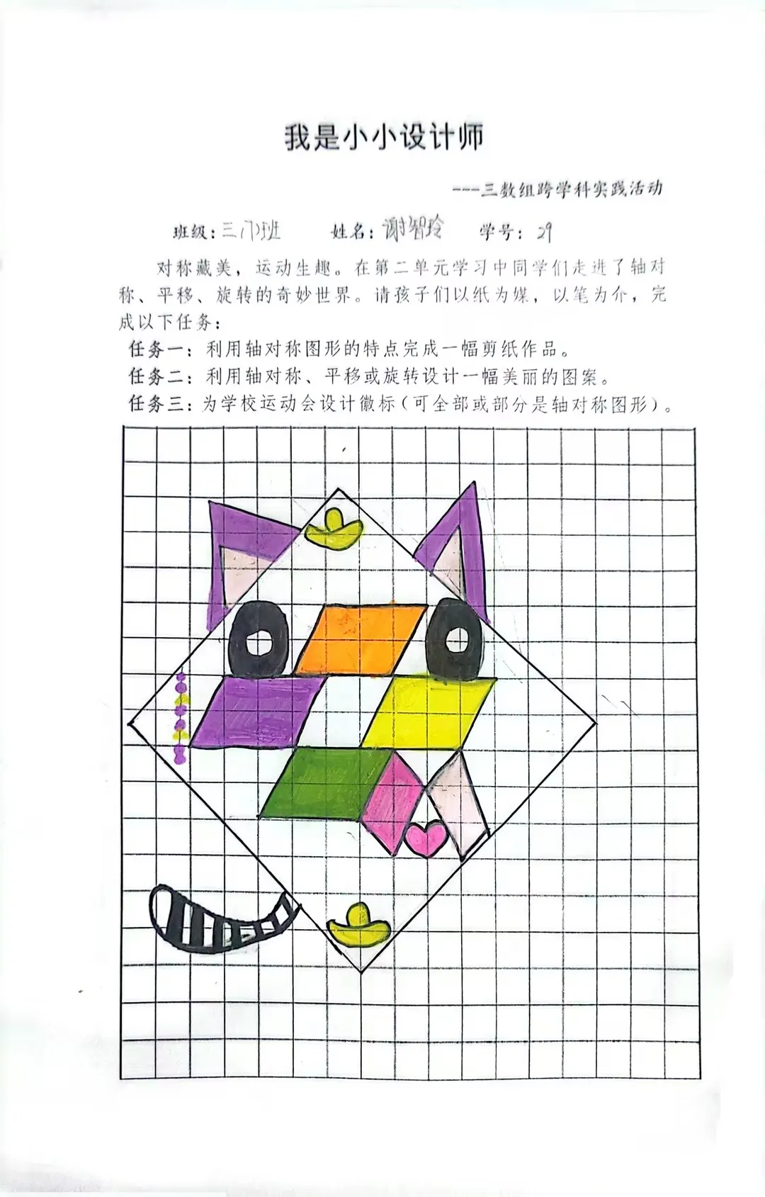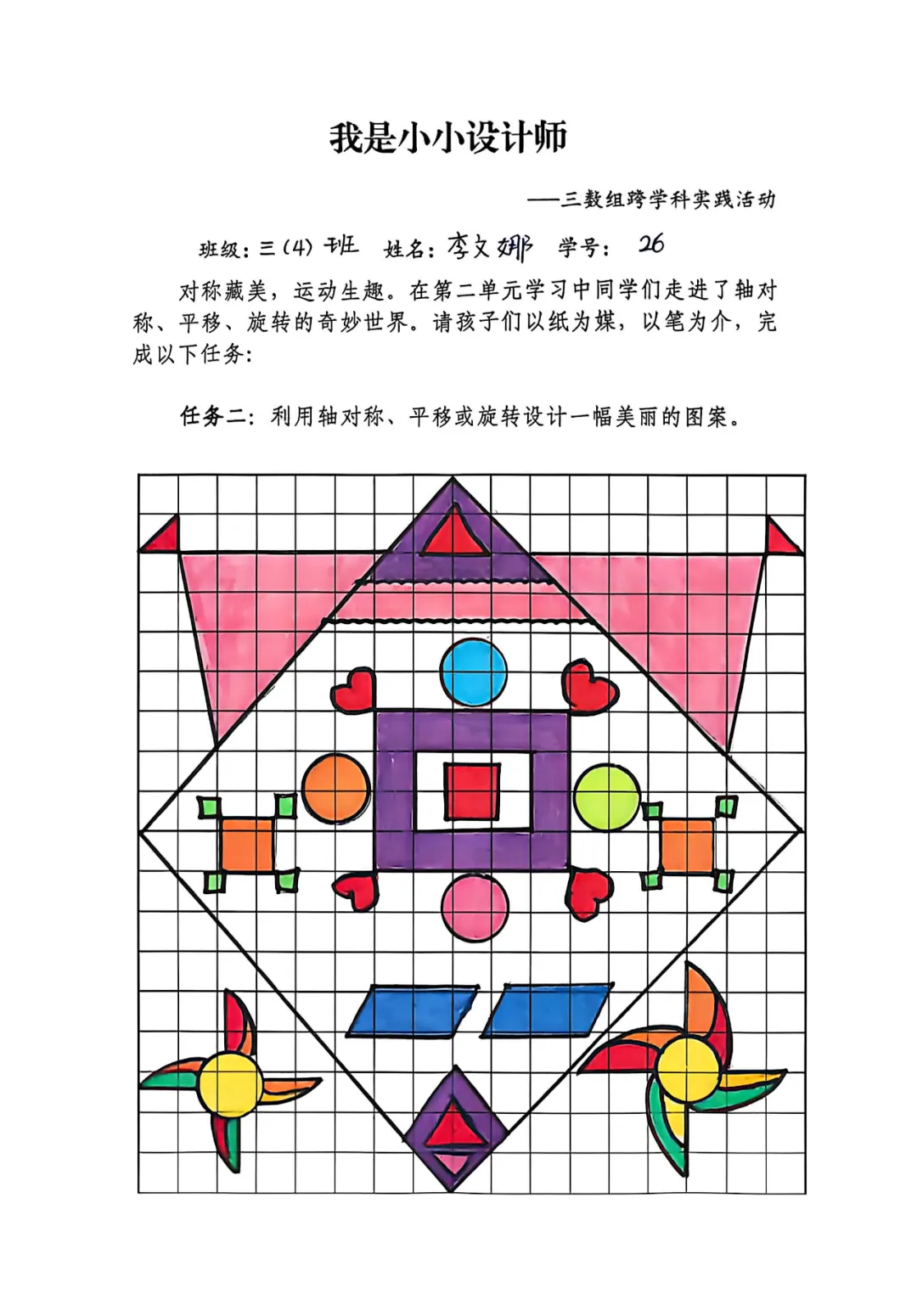 当数学遇上创意,会碰撞出怎样的火花?为帮助学生深入理解轴对称、平移、旋转的数学知识,感受数学与生活、艺术的紧密联系,宝鸡高新第二小学三年级数学学科开展了 “我是小小设计师” 为主题的跨学科实践活动。孩子们以纸为媒、以笔为介,在动手创作中沉浸式体验数学之美,用创意与巧手呈现出精彩纷呈的学习成果。