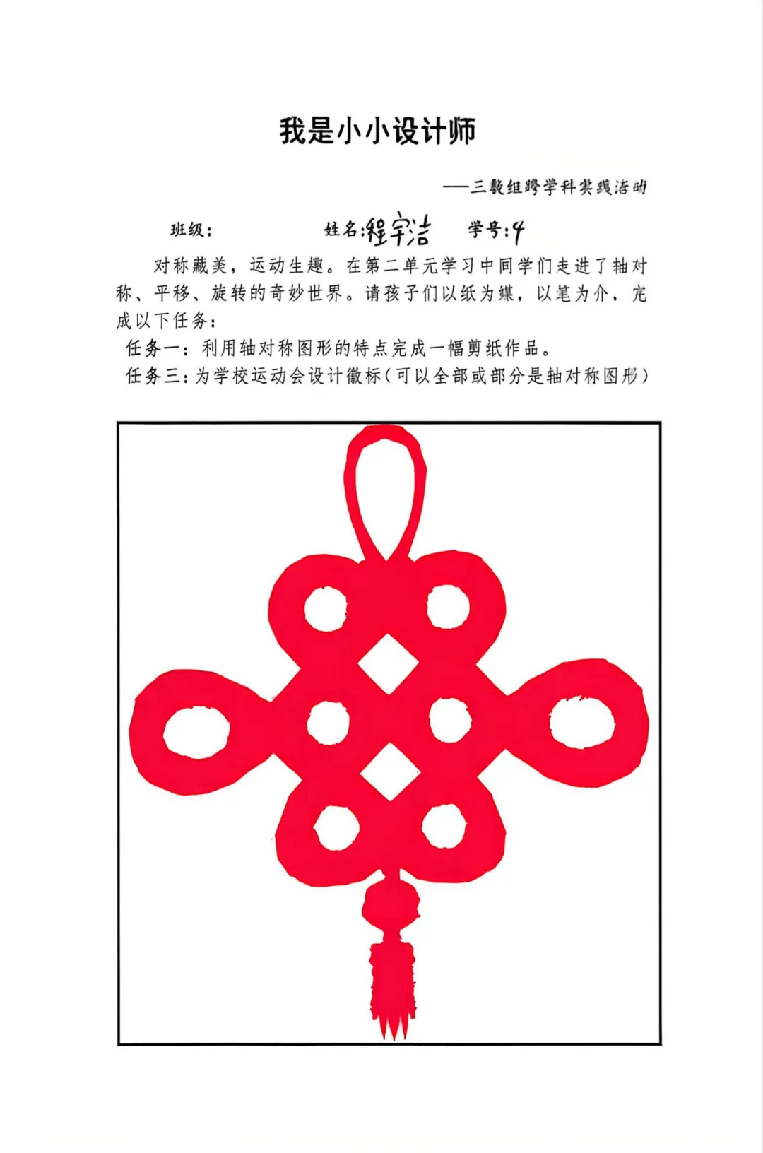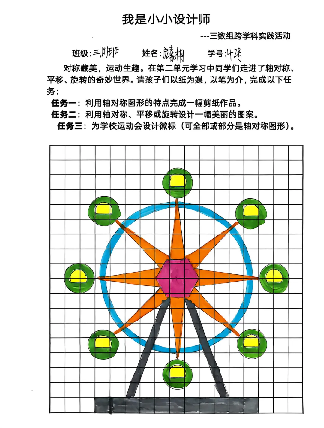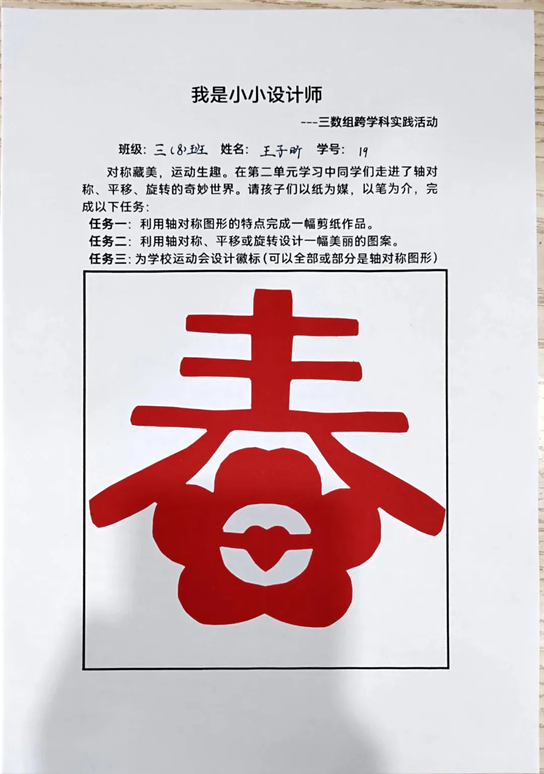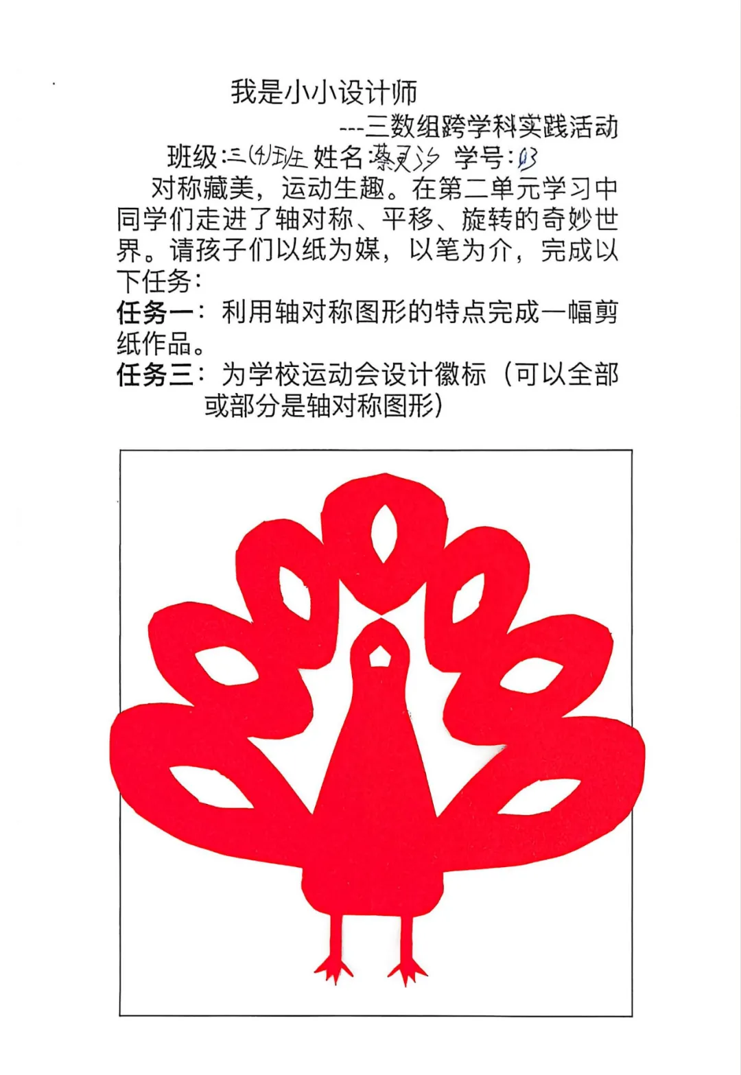 当数学遇上创意,会碰撞出怎样的火花?为帮助学生深入理解轴对称、平移、旋转的数学知识,感受数学与生活、艺术的紧密联系,宝鸡高新第二小学三年级数学学科开展了 “我是小小设计师” 为主题的跨学科实践活动。孩子们以纸为媒、以笔为介,在动手创作中沉浸式体验数学之美,用创意与巧手呈现出精彩纷呈的学习成果。