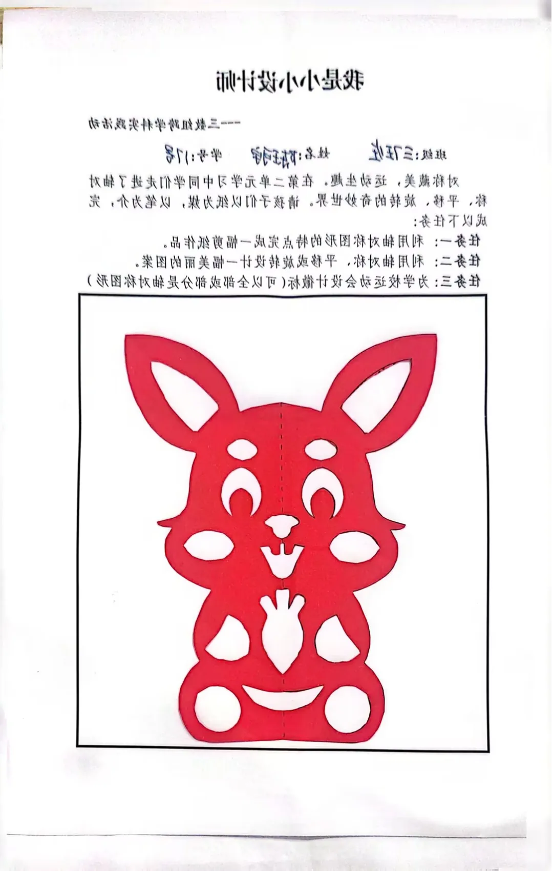 同学们围绕轴对称图形的特点,折一折、画一画、剪一剪,用一双双巧手创作出一幅幅精致的剪纸作品。对称的花纹、工整的造型、鲜艳的色彩,让传统剪纸艺术与数学知识完美融合。孩子们在折叠与裁剪中,直观感受轴对称的特点,体会 “对称带来的和谐与美感”。